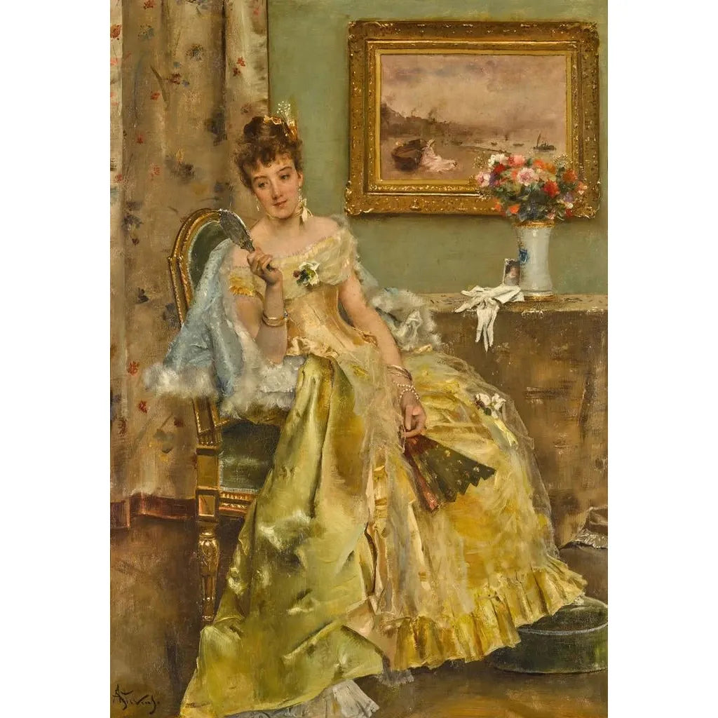 "Coquetterie" är ett konsttryck av Alfred Stevens som hyllar den kvinnliga skönheten och elegansen genom porträttet av en förfinad kvinna. Kompositionen, rik på detaljer, framhäver texturerna i kläderna och de subtila nyanserna i färgerna, vilket skapar en intim och sofistikerad atmosfär. Det mjuka ljuset som belyser huvudpersonens ansikte förstärker hennes charm och grace, medan hennes fängslande blick verkar bjuda in betraktaren att dela ett ögonblick av samförstånd. Denna målning återspeglar en tid då mode och kvinnlighet stod i centrum för konstnärliga intressen.