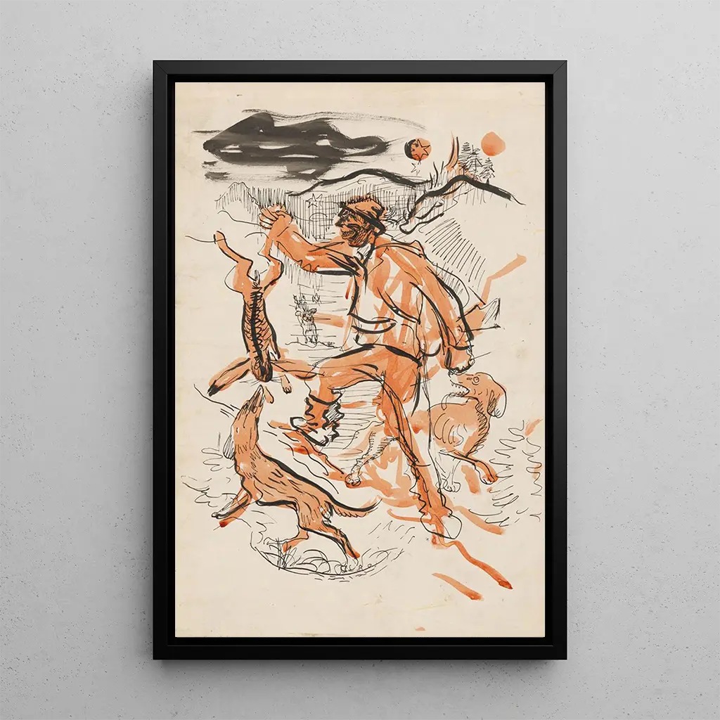 La konsttryck de "Chasse nocturne" d'Arnold Peter Weisz-Kubínčan évoque une atmosphère mystérieuse, où les silhouettes des chasseurs se fondent dans un paysage nocturne. Les teintes sombres dominent, rehaussées par des éclats de lumière qui illuminent subtilement les détails des personnages et de la faune environnante. La technique de l'artiste, mêlant réalisme et impressionnisme, crée une dynamique captivante, invitant le spectateur à plonger dans cette scène nocturne. Chaque coup de pinceau semble raconter une histoire, où la nature et l'homme coexistent dans une harmonie troublante.