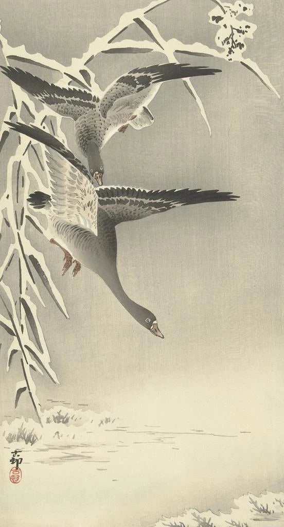 I detta delikata verk för oss Ohara Koson till hjärtat av ett snölandskap där två gäss med vit panna står lugnt. Kompositionen är fylld av mildhet, med kalla nyanser som framkallar vinterns lugn. De noggranna detaljerna i fjädrarna kontrasterar mot den orörda snöns vithet och skapar en lugnande atmosfär. Tekniken för ukiyo-e, som är karakteristisk för japansk konst, möjliggör fångsten av naturens flyktiga skönhet, samtidigt som den bjuder in betraktaren till en tyst kontemplation.