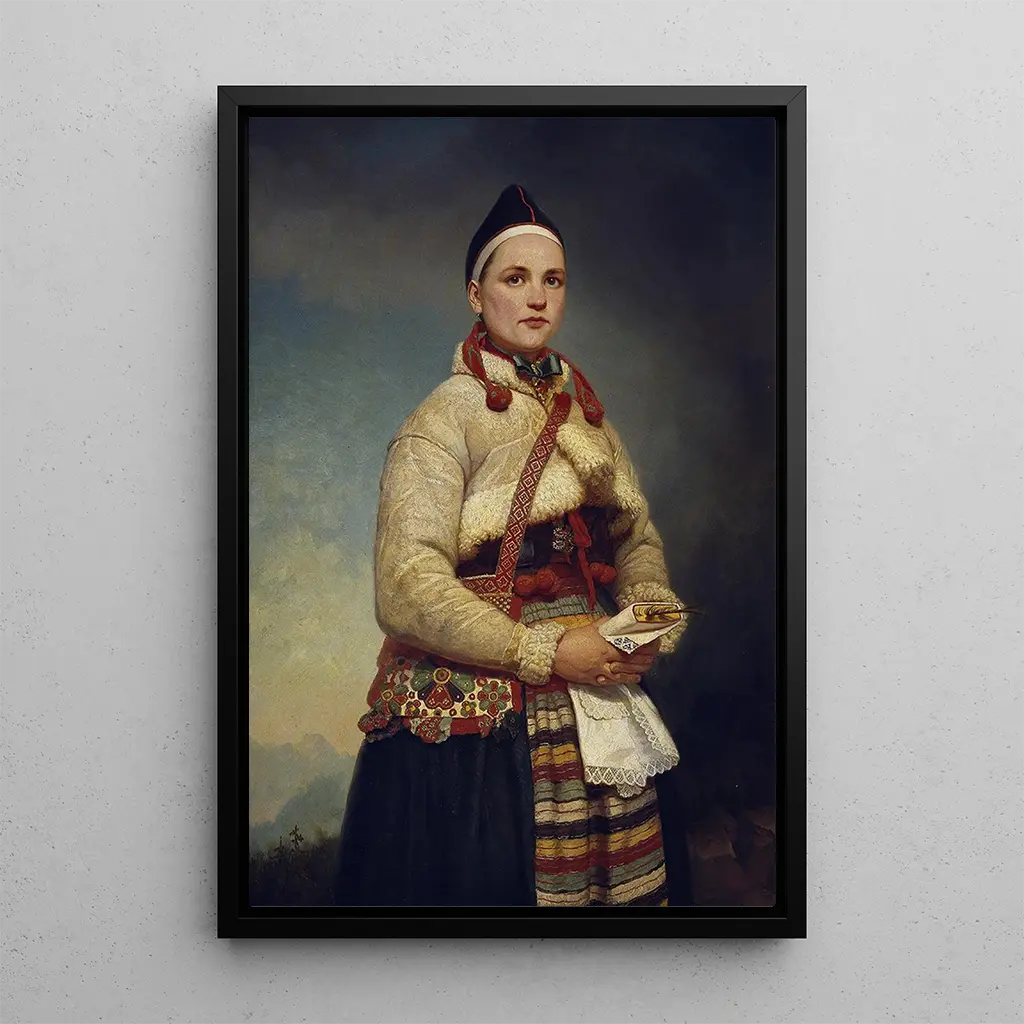 Konsttrycket Fille de Dalarna framkallar den tidlösa skönheten hos en ung kvinna klädd i traditionella svenska dräkter. De livfulla färgerna och de delikata mönstren på duken fångar essensen av den skandinaviska kulturen, samtidigt som de lyfter fram hennes ämnes grace och värdighet. Gottfrid Virgin, genom sin behärskning av nyanser och detaljer, lyckas förmedla en atmosfär av nostalgi och stolthet. Varje element i kompositionen, från den lugna bakgrunden till de noggrant återgivna accessoarerna, bidrar till att göra detta verk till en levande hyllning till Sveriges folkliga arv.