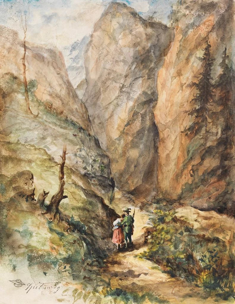Reproduktion Jägare och flickor - Carl Spitzweg – Fängslande introduktion I den rika och varierade världen av 1800-talets målarkonst utmärker sig "Jägare och flickor" av Carl Spitzweg genom sin charm och poesi. Detta verk, fyllt av en idyllisk atmosfär, inbjuder betraktaren att fördjupa sig i ett enkelt och glatt ögonblick av liv. Scenen skildrar med fin känsla ett oväntat möte mellan jägare och unga flickor, vilket både framkallar den spirande kärlekens lätthet och den omgivande naturens skönhet. Detta konstverk, med sin elegans, för oss till en värld där naturen och mänskliga relationer vävs samman i harmoni, och avslöjar en emotionell djup som går bortom en enkel avbildning. Stil och unikhet i verket Spitzwegs stil kännetecknas av noggrann uppmärksamhet på detaljer och en mjuk, varm färgpalett. I "Jägare och flickor" använder konstnären naturliga nyanser som framkallar landsbygdens landskap, vilket skapar en lugn och välkomnande atmosfär. Figurerna, som är fint återgivna, vittnar om en äkthet och en livsglädje som berör hjärtat. Kompositionen, balanserad och dynamisk, leder blicken genom scenen och avslöjar gradvis subtiliteter i interaktionen mellan protagonisterna. Varje element, vare sig det är de frodiga lövverken eller de traditionella kostymerna, bidrar till helhetens harmoni och gör detta konstverk till en sann hyllning till enkelheten och skönheten i vardagslivet. Konstnären och hans inflytande Carl Spitzweg, en ikonisk figur inom tysk romantik, är ofta erkänd för sin förmåga att fånga nyanser av det mänskliga livet genom sina verk. Hans karriär, präglad av en produktiv konstnärlig produktion, vittnar om ett djupt engagemang för teman som natur, kärlek och ensamhet. Påverkad av samtida litterära strömningar lyckas Spitzweg tillföra en narrativ dimension till sina målningar, vilket gör varje konstverk till mer än bara ett föremål för beundran, utan också till en egen berättelse. Hans inflytande består och inspirerar många samtida konstnärer som strävar efter att förena estetik och känsla i sina skapelser. "Jägare och flickor" passar perfekt in i denna tradition och ekar av universella mänskliga bekymmer som går igenom tiderna. En dekoration