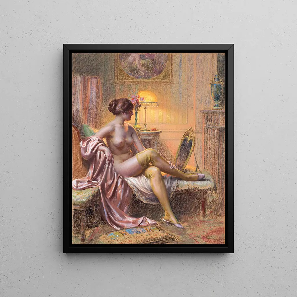 La Toilette par lampe - Delphin Enjolras är ett verk som utmärker sig genom sin finhet och intima atmosfär. I denna scen där det dämpade ljuset från en lampa smeker de kvinnliga formerna, lyckas konstnären fånga ett ögonblick av liv, ett ögonblick som svävar mellan intimitet och kontemplation. Kompositionen, samtidigt enkel och rik på känslor, inbjuder betraktaren att tränga in i den personliga världen hos den avbildade kvinnan. Denna tavla, en sann hyllning till kvinnlig skönhet, väcker känslor av mildhet och frid, samtidigt som den avslöjar Enjolras tekniska skicklighet. Genom detta verk ger konstnären oss inte bara en bild av kvinnan, utan också en inblick i livsstilen i slutet av 1800-talet, där elegans blandas med enkelhet.