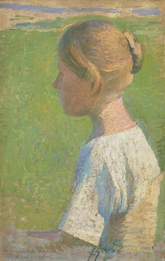 Henri Martin, né en 1860, est un peintre français dont l'œuvre s'inscrit dans le mouvement impressionniste. Formé à l'École des beaux-arts de Toulouse, il est influencé par des artistes tels que Monet et Pissarro. Sa carrière s'étend sur plusieurs décennies, durant lesquelles il explore différents thèmes, notamment les paysages et les portraits. "Jeune femme de profil" témoigne de son habileté à capturer la lumière et l'émotion, tout en reflétant les préoccupations artistiques de son époque. Martin est reconnu pour sa capacité à créer des atmosphères poétiques, faisant de lui une figure importante de l'art français.