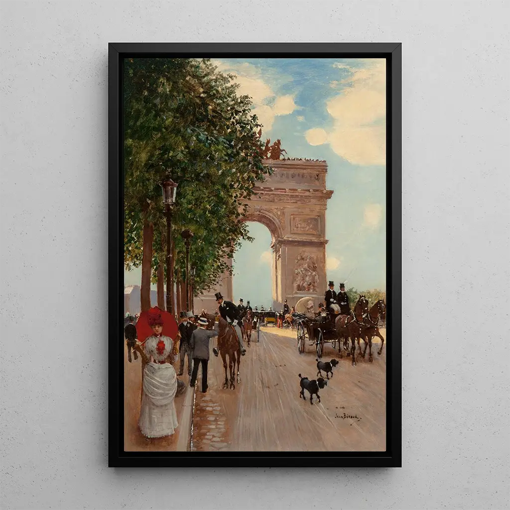 Konsttrycket av "L'Arc de Triomphe Champs-Élysées" av Jean Béraud framkallar majestät och betydelsen av detta ikoniska monument. I detta verk reser sig bågen stolt mitt i en livlig scen, där förbipasserande och fordon flätas samman. De livfulla färgerna och de noggranna detaljerna avslöjar Paris pulserande liv, samtidigt som de lyfter fram den arkitektoniska skönheten hos bågen. Bérauds teknik, som förenar realism och impressionism, gör det möjligt att känna stadens energi samtidigt som den ger en intim blick på denna plats full av historia.