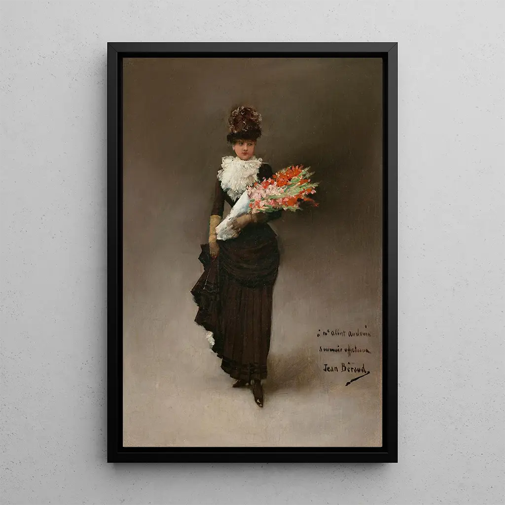 I konsttrycket av "Young woman with a bouquet of flowers" fördjupar Jean Béraud oss i en värld av ömhet och friskhet. Tavlan föreställer en ung kvinna, strålande, som håller ett blomsterarrangemang av lysande blommor som kontrasterar mot hennes eleganta klädsel. De livfulla färgerna och de noggranna detaljerna i blommorna skapar en glad och livlig atmosfär. Ljuset spelar en avgörande roll i detta verk, som lyser upp den unga kvinnans ansikte och framhäver blombladens skönhet. Bérauds teknik, präglad av finhet, avslöjar hans talang för att fånga naturens flyktiga skönhet.