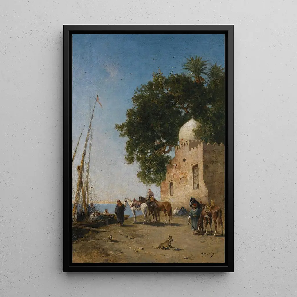 I denna konsttryck av målningen "Beni Souef Égypte" förflyttar Narcisse Berchère oss till hjärtat av ett egyptiskt landskap fyllt av mystik och skönhet. Kompositionen framhäver varma och gyllene nyanser, som påminner om solljusets reflektioner på dynorna. De noggrant utarbetade detaljerna i figurerna och de naturliga elementen skapar en atmosfär av lugn, där tiden tycks stå still. Konstnären använder en oljemålningsteknik som ger liv åt texturerna, vilket gör varje sandkorn och varje reflektion på vattnet otroligt realistiskt. Detta konsttryck inbjuder till eftertanke och ger en glimt av en svunnen tid, samtidigt som det hyllar naturens majestät.