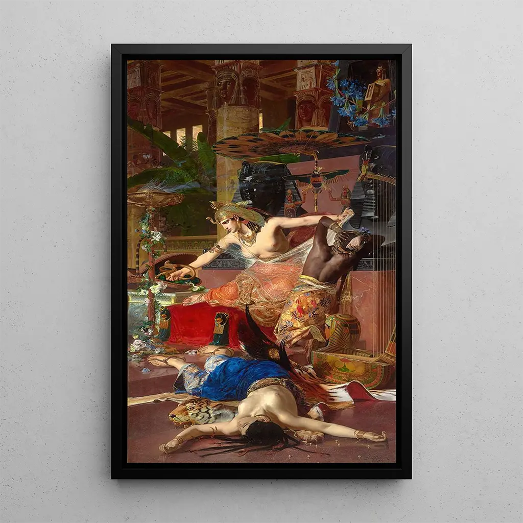Cléopâtre, en ikonisk figur inom historien, är här vackert fångad av Julius Kronberg. I detta konsttryck skildrar konstnären den egyptiska drottningen med en oöverträffad grace och majestät. De rika färgerna och de minutiösa detaljerna i ornamenten understryker hennes kungliga status, medan hennes ansiktsuttryck väcker både visdom och förförelse. Kompositionen, balanserad och harmonisk, förflyttar betraktaren till det fascinerande universumet av det gamla Egypten, där skönhet och makt blandas i en tidlös balett.