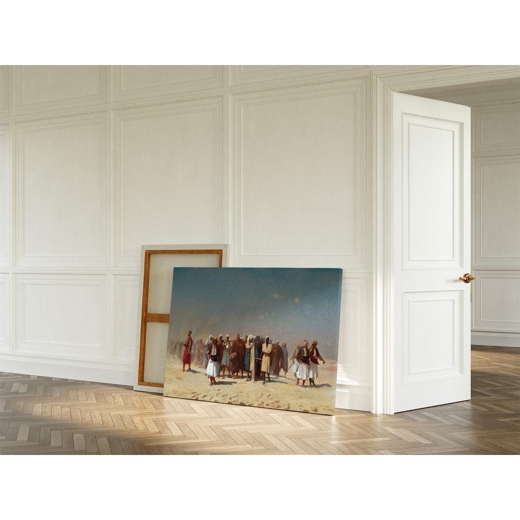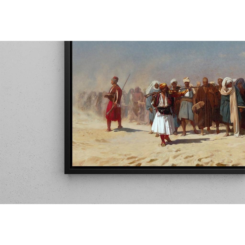 I verket Egyptiska rekryter som korsar öknen av Jean-Léon Gérôme, målat 1857, transporteras åskådaren till hjärtat av ett ökenlandskap präglat av mysterium och spänning. Vid denna tidpunkt bekräftar Gérôme sig som en mästare av realism, som skickligt förenar en raffinerad teknik med en djup förståelse för mänskligheten. Verket vittnar om hans exceptionella talang att fånga rörelse och känsla, och illustrerar soldater i marsch under en brännande himmel, som passerar genom sanddyner som framkallar kamp och beslutsamhet.