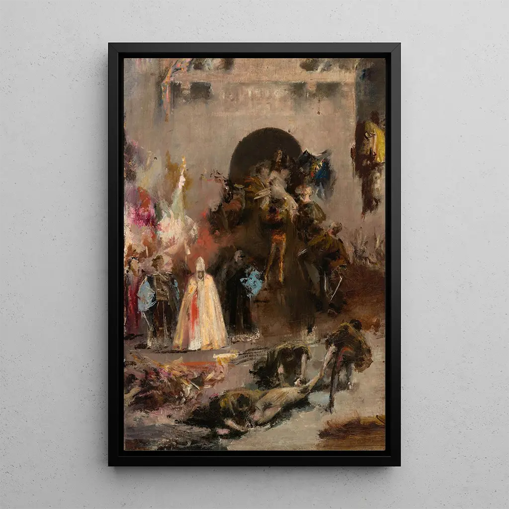 Henri Regnault, född 1843, är en fransk konstnär vars verk utmärks av sitt engagemang för historiska och sociala ämnen. Utbildad vid École des beaux-arts i Paris, hämtar han inspiration från stora mästare samtidigt som han utvecklar sin egen stil. Hans karriär, trots att den tragiskt avbröts av hans död vid 28 års ålder, präglas av kraftfulla verk som ifrågasätter den mänskliga tillvaron. Scène de l'Inquisition espagnole är emblematiskt för hans talang att behandla mörka och komplexa teman, och visar hans intresse för historia och psykologin hos figurerna.