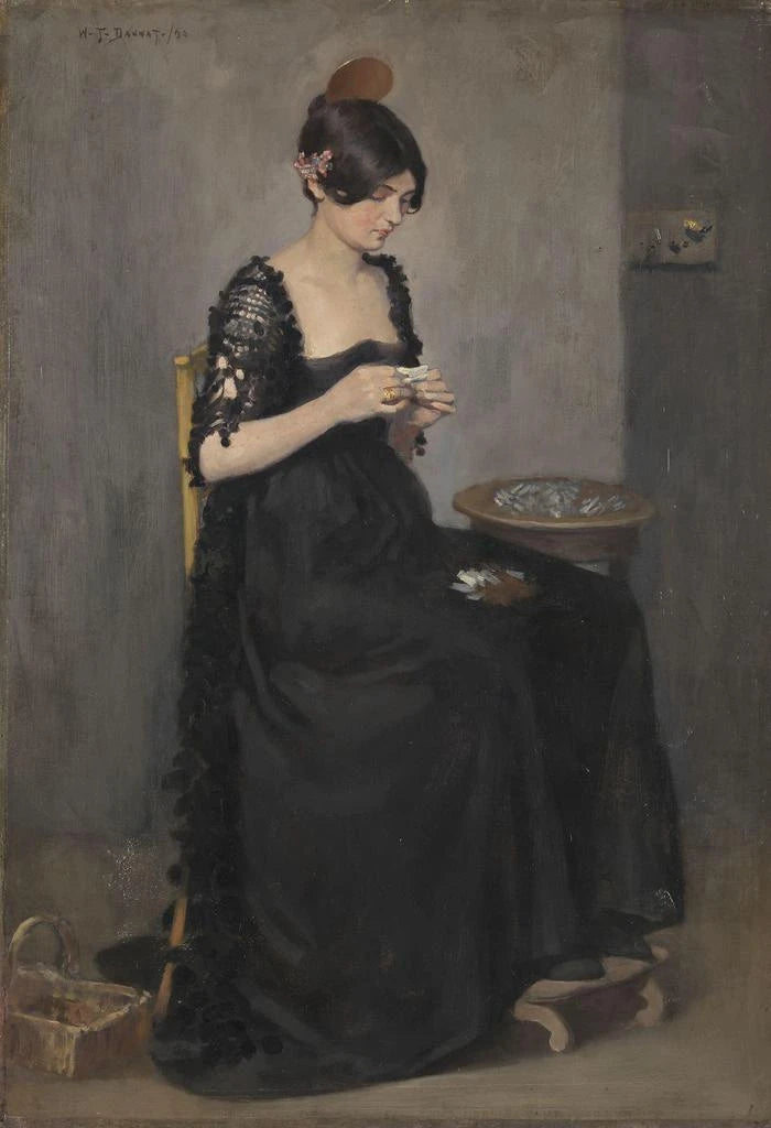 William Turner Dannat, verksam i slutet av 1800-talet, är en amerikansk konstnär vars arbete är en del av realismen. Påverkad av europeiska mästare har han lyckats integrera element av den spanska kulturen i sina verk, vilket vittnar om ett intresse för hantverkstraditioner och populära levnadssätt. Hans förmåga att skildra vardagsscener med sådan finhet och noggrannhet har gjort honom till en respekterad målare i sin tid. Dannat har därmed bidragit till att sprida kunskap om den spanska kulturen till en bredare publik och berikat den konstnärliga dialogen under sin epok.
