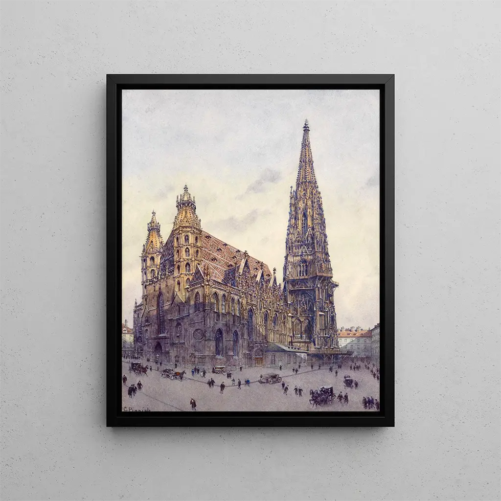 Reproduktion av Stephanskirche i Wien - Carl Pippich – Fängslande introduktion Föreställningen av Stephanskirche i Wien av Carl Pippich är mycket mer än en enkel illustration av ett ikoniskt monument. Den förkroppsligar själva själen av staden, en subtil blandning av historia och modernitet, mellan majestätisk arkitektur och vibrerande atmosfär. Saint-Étienne-katedralen, med sina spetsiga spira och sitt färgglada tak, reser sig som en symbol för Wiens motståndskraft genom tiderna. Pippich, genom att fånga denna ikon, inbjuder oss att utforska inte bara den fysiska strukturen, utan också den känsla och andlighet som utstrålar från denna byggnad. Varje penseldrag, varje nyans av färg, framkallar en historia, ett kollektivt minne som överskrider tidens gränser. Stil och unikhet i verket Pippichs verk utmärker sig genom sin förmåga att förena realism och impressionism, och skapar därigenom en atmosfär som är både påtaglig och eterisk. De arkitektoniska detaljerna i Stephanskirche återges med en anmärkningsvärt precision, men det är i ljusbehandlingen som konstnären verkligen excellerar. Reflektionerna av solen på katedralens stenar, de delikata skuggorna som projiceras på gatstenen, bidrar alla till en känsla av liv som ger liv åt duken. Pippich leker skickligt med färgerna, använder varma och kalla toner för att skapa en dynamik som fångar ögat och inbjuder till eftertanke. Denna unika metod gör det möjligt för betraktaren att känna Wiens energi, en stad där dåtid och nutid vävs samman i harmoni. Konstnären och hans inflytande Carl Pippich, född i en konstnärlig miljö, har utvecklat en stil som är helt hans egen samtidigt som han inspireras av de stora mästarna inom konsthistorien. Hans bana har lett honom till att utforska olika tekniker och rörelser, men det är hans engagemang för att skildra arkitektur som utmärker honom. Påverkad av impressionisterna lyckas han ge sina verk en nästan levande dimension. Pippich nöjer sig inte med att reproducera scener; han tolkar dem, omtolkar dem, och erbjuder därigenom en personlig vision som resonerar med sin tid. Hans blick på Stephanskirche är fylld av en mild nostalgi