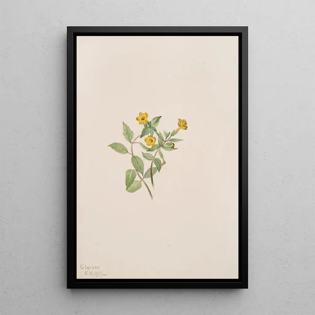 Den konsttryck av Fleur de musc, eller Mimulus moschatus, erbjuder en poetisk syn på naturen. De livfulla nyanserna av gult och orange blandas subtilt, vilket skapar en varm och välkomnande atmosfär. Akvarelltekniken, som används av Mary Vaux Walcott, fångar lättheten och transparensen hos blommornas kronblad, samtidigt som den hyllar den flyktiga skönheten hos denna blomma. Varje detalj, från bladnervarnas till de delikata nyanserna i blommorna, inbjuder till en noggrann och respektfull betraktelse av naturen.