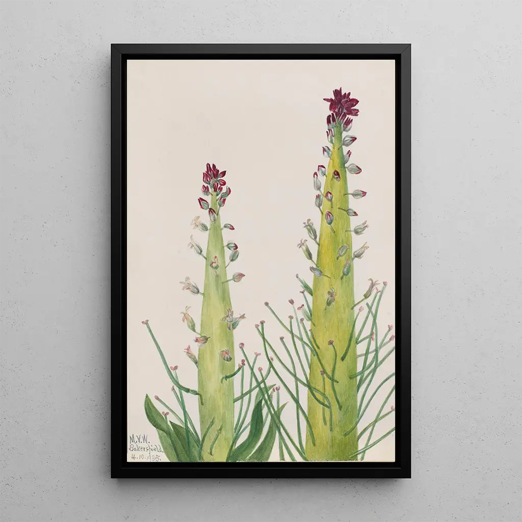 Desert Candle Caulanthus inflatus : en hyllning till ökenens skönhet Konsttrycket av Desert Candle Caulanthus inflatus fördjupar oss i en värld av ömhet och ljus. Nyanser av grönt och gult flätas samman för att ge liv åt denna ikoniska ökenväxt. Akvarelltekniken, som används av Mary Vaux Walcott, möjliggör fångsten av genomskinligheten i blommornas kronblad och den subtila texturen på bladen. Atmosfären som avtecknar sig i detta verk är både lugn och fascinerande, inbjudande betraktaren att utforska naturens under. Varje detalj, varje skugga, är noggrant återgiven, vilket skapar en känsla av fördjupning i ett torrt men livfullt landskap. Mary Vaux Walcott : en pionjär inom botanisk konst Mary Vaux Walcott, aktiv i början av 1900-talet, är erkänd för sina bidrag till amerikansk botanisk konst. Påverkad av de naturalistiska rörelserna under sin tid, lyckades hon förena vetenskap och estetik i sina verk. Hennes illustrationer, ofta skapade under resor genom USA, vittnar om en djup respekt för naturen och en vilja att bevara den. Som medlem i American Botanical Society har hon också spelat en nyckelroll i att öka medvetenheten om biologisk mångfald. Hennes förmåga att avbilda växter med sådan precision gör henne till en oumbärlig figur inom området för botanisk konst. En dekorativ förvärv med många fördelar Konsttrycket av Desert Candle Caulanthus inflatus är ett perfekt dekorativt föremål för att berika ditt hem, vare sig det är i ett vardagsrum, ett kontor eller ett sovrum. Dess utskriftskvalitet garanterar en enastående trohet mot färger och detaljer i det ursprungliga verket. Genom att integrera detta konstverk tillför du en touch av natur och lugn till ditt utrymme, samtidigt som du hyllar Mary Vaux Walcotts konstnärliga arv. Dess estetiska tilltalande och dess förmåga att väcka eftertanke gör det till ett oumbärligt verk för konst- och botanikkännare.