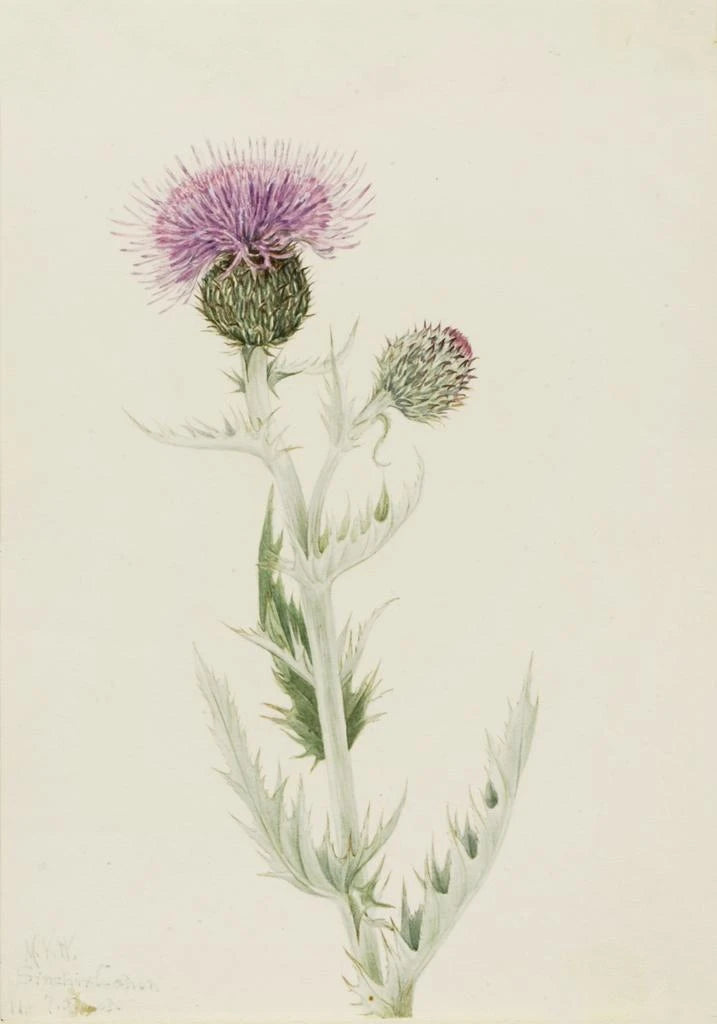 Mary Vaux Walcott, aktiv i början av 1900-talet, är erkänd för sin viktiga roll inom botanisk konst. Påverkad av de naturalistiska rörelserna under sin tid, lyckades hon förena vetenskap och estetik i sina verk. Hennes passion för botanik ledde henne till att utforska de amerikanska landskapen, där hon noggrant dokumenterade den lokala floran. Walcott var också en passionerad förespråkare för naturvård, vilket gav henne en framstående plats i konsthistorien. Hennes verk, inklusive "Chardon des prairies", vittnar om hennes engagemang för den naturliga skönheten och bevarandet av arter.