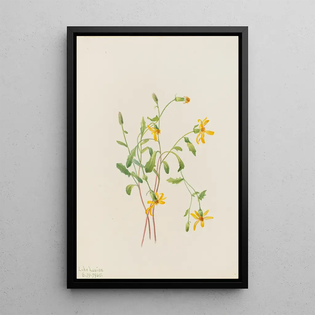 Konsttrycket av Senecio alpina, utfört av Mary Vaux Walcott, lyfter fram den storslagna skönheten i bergslandskap. Med sina lysande gula blommor väcker detta verk glädje och livskraft i höglandet. Nyansen av grönt och gult, noggrant återgiven, skapar en ljus och dynamisk atmosfär. Akvarelltekniken gör det möjligt för konstnären att fånga lättheten i blommans kronblad samtidigt som den betonar växtens robusthet, en symbol för motståndskraft mot de extrema klimatförhållandena i bergen.