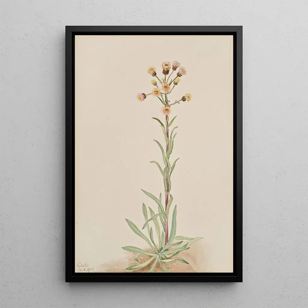 Konsttrycket av Vergerette élevée Erigeron acris av Mary Vaux Walcott framkallar prärländernas prakt i Amerika. De livfulla nyanserna av gult och vitt, kombinerade med en delikat bakgrund, skapar en ljus och glad komposition. Akvarelltekniken gör det möjligt för konstnären att fånga blommornas lätthet samtidigt som den hyllar deras robusthet. Varje blomblad tycks dansa i brisen och bjuder in betraktaren att fördjupa sig i ett vibrerande och livfullt naturlandskap.