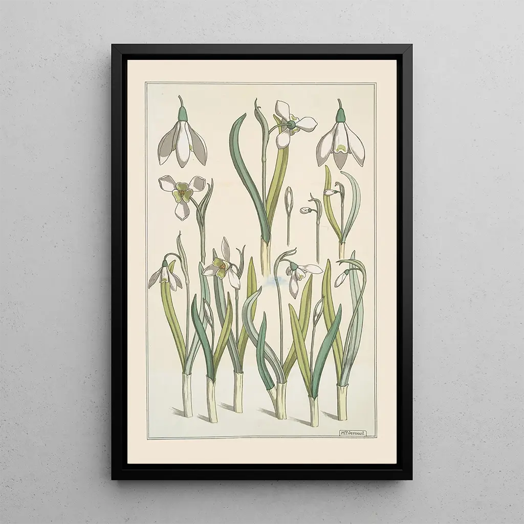 Konsttrycket Perce-neige av Maurice Pillard Verneuil framkallar den tidiga vårens mildhet. Med sina delikata nyanser av vitt och grönt fångar detta verk den sköra skönheten hos blommor som spirar ur smältande snö. Konstnärens teknik, som kombinerar akvarell och teckning, skapar en lätt och luftig atmosfär som inbjuder till eftertanke. De noggranna detaljerna i kronblad och blad, tillsammans med en suddig bakgrund, förstärker känslan av lätthet och förnyelse, vilket gör detta konsttryck till en sann hyllning till naturen.