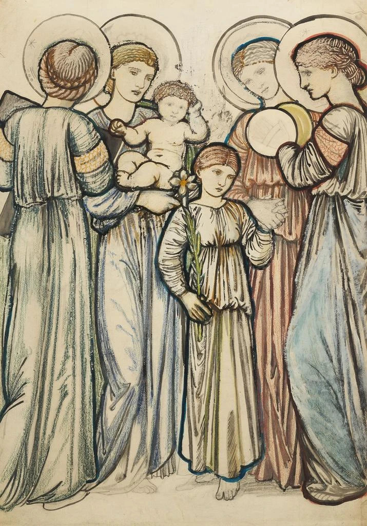 Sir Edward Coley Burne-Jones, en ikonisk figur inom den pre-rafaelitiska rörelsen, lyckades förena romantik och symbolism i sina verk. Född 1833, påverkades han av konstnärer som Dante Gabriel Rossetti och William Morris, med vilka han samarbetade. Hans skapandeperiod, som huvudsakligen sträcker sig från slutet av 1800-talet till början av 1900-talet, präglas av en strävan efter skönhet och andlighet. "Anges och barn" är ett uttryck för denna sökning och vittnar om hans intresse för mytologiska och religiösa teman. Burne-Jones har lämnat ett bestående konstnärligt arv som inspirerat många samtida och framtida konstnärer att utforska liknande motiv.