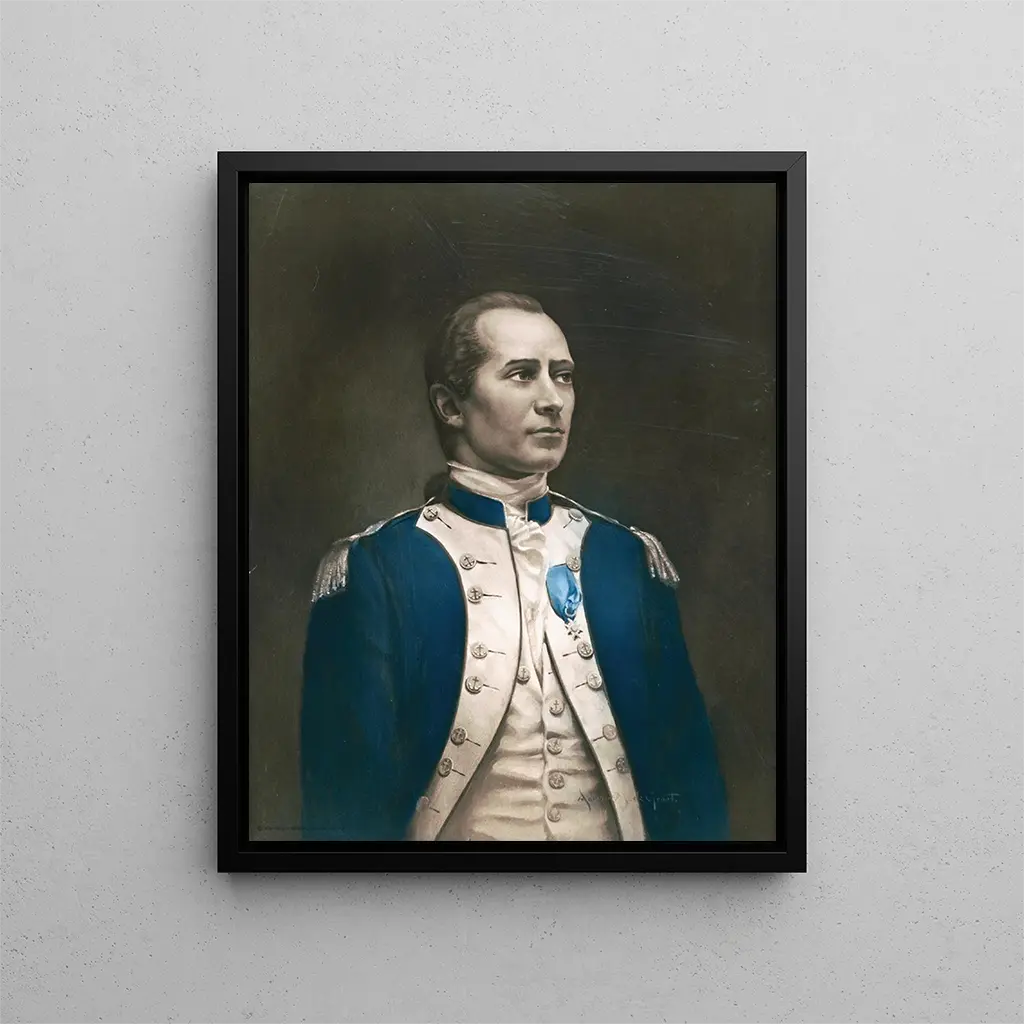 Upptäck själva essensen av maritim konst genom konsttrycket John Paul Jones - Adriaan M. de Groot. Detta ikoniska verk hyllar en av hjältarna från den amerikanska revolutionen, John Paul Jones, känd för sina djärva bedrifter till sjöss. Konstnären, Adriaan M. de Groot, lyckas fånga inte bara karisman hos sin modell utan också tidsandan, vilket återspeglar en period av kamp och mod. Den dynamiska kompositionen och den subtila användningen av färger bjuder in betraktaren att fördjupa sig i en rik visuell berättelse, där varje detalj berättar en historia om heroism och beslutsamhet. Stil och unikhet i verket Adriaan M. de Groot's tekniska skicklighet visar sig i varje penseldrag, där ljus och skugga vävs samman för att ge liv åt en livfull scen. Skildringen av John Paul Jones är fylld av en dramatisk intensitet som går bortom en enkel porträtt. Nyanser av blått och grått återspeglar det stormiga havet, medan guldinslagen påminner om tidigare ära. Jones bestämda hållning och det resoluta uttrycket i hans ansikte vittnar om hans obändiga karaktär. Verket är en del av en konstnärlig tradition som värdesätter realism samtidigt som det integrerar emotionella element, vilket skapar en atmosfär som fascinerar och förflyttar betraktaren till det förflutna. Konstnären och hans inflytande Adriaan M. de Groot är en konstnär vars arbete ofta är kopplat till att återupptäcka historiska figurer genom ett modernt konstnärligt prisma. Hans unika tillvägagångssätt kombinerar klassiska tekniker med en samtida känsla, vilket möjliggör en nytolkning av viktiga historiska ögonblick med emotionell djup. De Groot hämtar inspiration från betydelsefulla händelser, och hans passion för maritim konst gör att han utmärker sig inom ett rikt och varierat konstlandskap. Som konstnär strävar han inte bara efter att porträttera historiska personer utan också att väcka universella känslor som mod, ära och uppoffring. En exceptionell väggdekoration signerad Artem Legrand Genom att välja detta konsttryck, väljer du ett konstverk som överskrider tid och rum, och som ekar av historien samtidigt som det berikar ditt hem. John Paul Jones - Adriaan M. de Groot är mycket mer än en enkel väggprydnad; det är en inbjudan till reflektion och flykt. Signerat Artem Legrand, integreras detta verk harmoniskt i olika inredningsstilar, oavsett om det är ett klassiskt, modernt eller eklektiskt hem. Det blir ett samtalsämne som väcker nyfikenhet och beundran. Genom att lägga till detta konstverk i din samling, skönjer du inte bara ditt utrymme, utan knyter också an till ett kulturellt arv av ovärderlig rikedom.