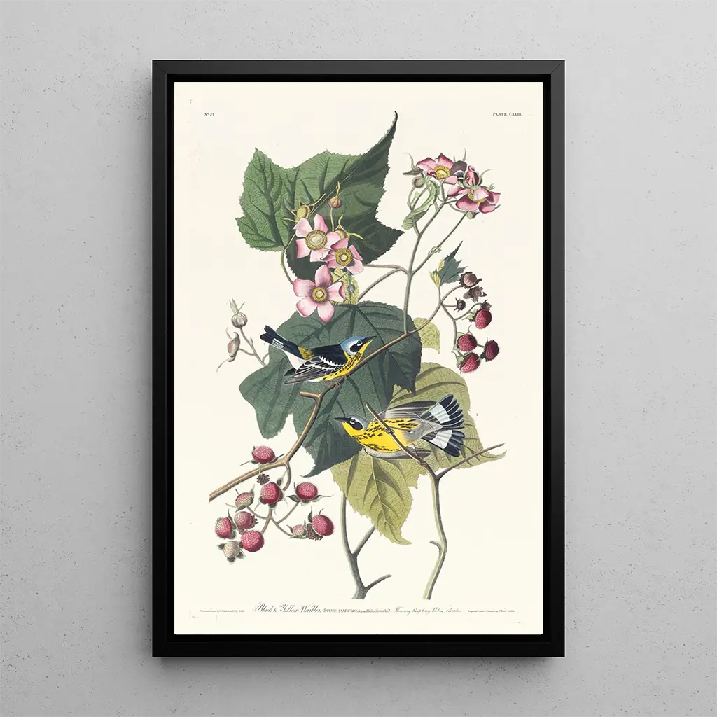 John James Audubon, naturaliste et peintre, est reconnu pour son approche novatrice de l’ornithologie au début du XIXe siècle. Né en Haïti en 1785, il a émigré aux États-Unis, où il a consacré sa vie à l’étude des oiseaux. Influencé par le romantisme et le réalisme, Audubon a su marier l’art et la science, créant des œuvres qui sont à la fois des études précises et des chefs-d'œuvre esthétiques. Son travail a eu un impact durable sur la conservation de la nature et a inspiré de nombreux artistes et scientifiques. La Paruline noire et jaune fait partie de son célèbre ouvrage "Birds of America", qui reste une référence incontournable dans le domaine de l’ornithologie.