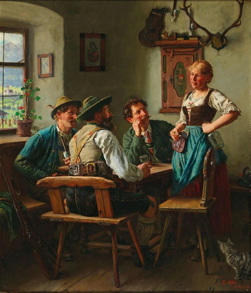 Emil Rau, en framstående figur i början av 1900-talet, lyckades etablera sig som en oumbärlig målare av sin tid. Påverkad av naturalistiska och impressionistiska strömningar utvecklade han en egen stil, kännetecknad av en skarp känslighet för vardagen. Rau fångade essensen av scener ur det folkliga livet, och lyfte fram interaktionerna mellan individer i bekanta sammanhang. Hans verk begränsar sig inte till enkel skildring, utan strävar efter att skapa en dialog mellan betraktaren och motivet. Genom sitt tillvägagångssätt banade han väg för många andra konstnärer som senare utforskade teman kring vardagen, och hyllade skönheten i enkla och äkta ögonblick.