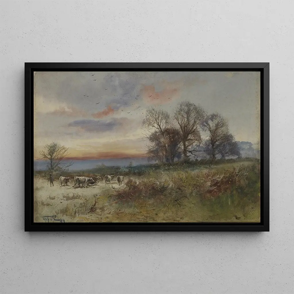 À Claygate, Surrey : un regard nostalgique sur la vie rurale Le tableau À Claygate, Surrey de Sir William Fox évoque une scène bucolique empreinte de douceur et de tranquillité. Les couleurs chaudes et terreuses, associées à une lumière dorée, créent une atmosphère accueillante et nostalgique. La composition, qui met en avant des paysages verdoyants et des maisons pittoresques, transporte le spectateur dans un moment de sérénité, loin de l'agitation urbaine. La technique de peinture à l'huile, maîtrisée par l'artiste, confère une texture riche et vivante à l'œuvre, rendant chaque détail presque palpable. Sir William Fox : un témoin de la vie victorienne Sir William Fox, peintre britannique du XIXe siècle, est connu pour ses représentations de la vie rurale et de la nature. Son travail s'inscrit dans le mouvement artistique victorien, où l'accent était mis sur la beauté des paysages et la simplicité de la vie quotidienne. Influencé par les impressionnistes, Fox a su capturer la lumière et l'atmosphère de ses sujets avec une sensibilité unique. Sa carrière, marquée par une exploration constante des thèmes de la ruralité, a fait de lui un artiste respecté, dont les œuvres continuent d'inspirer les amateurs d'art. Une acquisition décorative aux multiples atouts La reproduction du tableau À Claygate, Surrey est une pièce décorative qui s'intègre parfaitement dans divers styles d'intérieur, qu'il s'agisse d'un salon chaleureux ou d'un bureau inspirant. Sa représentation idyllique de la campagne anglaise apporte une touche de charme et de tranquillité à votre espace. La qualité de la reproduction assure une fidélité exceptionnelle à l'œuvre originale, permettant de savourer chaque nuance de couleur et chaque détail. En choisissant cette toile, vous ajoutez non seulement une œuvre d'art à votre décor, mais aussi un morceau d'histoire et de culture qui enrichira votre quotidien.