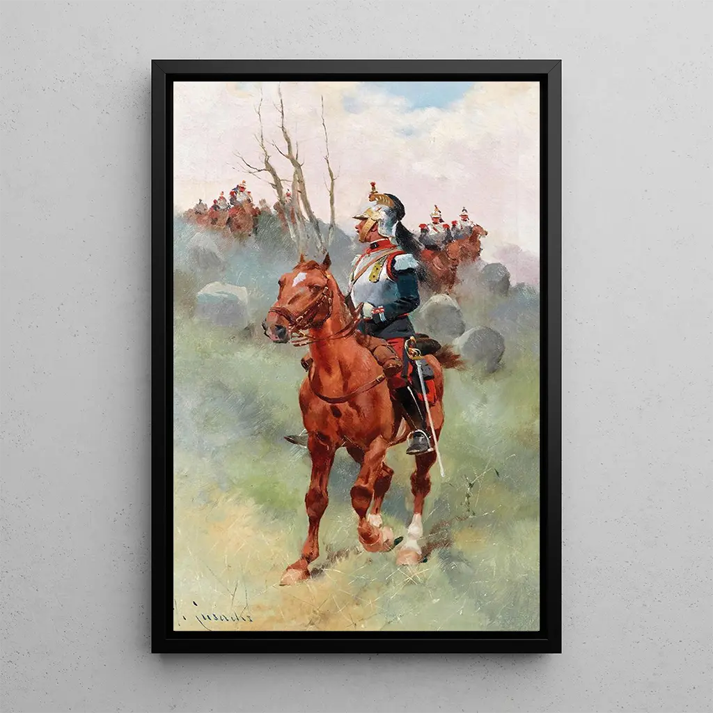 Konsttrycket av "På truppens huvud" är ett dekorativt inslag som tillför elegans och karaktär till ditt utrymme. Oavsett om det är i ett kontor, ett vardagsrum eller ett utställningsrum, drar detta konstverk till sig uppmärksamhet och väcker diskussioner om historia och tapperhet. Kvaliteten på trycket garanterar en exceptionell trohet mot detaljerna i originalverket, vilket gör det möjligt att fullt ut uppskatta Cusachs talang. Genom att integrera detta konsttryck i din inredning väljer du ett verk som förenar estetik och historia, samtidigt som du hyllar militär heroism genom tiderna.