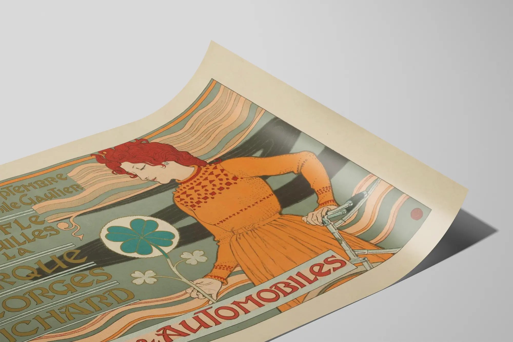 Découvrez cette affiche vintage élégante et artistique dédiée aux cycles et automobiles de la marque Georges Richard. Ce poster publicitaire illustre avec finesse et style l’esprit des débuts de l’ère industrielle du transport personnel. L’image met en scène une femme vêtue d’une robe orange, tenant un grand trèfle à quatre feuilles, symbole de chance et de qualité, tenu également par un vélo dont le guidon est visible dans la composition. Le graphisme combine des couleurs douces et harmonieuses : des nuances d’orange, de vert, de beige et de noir qui apportent une touche rétro et raffinée à la décoration murale. Le choix des typographies originales, aux lignes courbes et marquées, donnent un cachet authentique à cette affiche publicitaire ancienne. Le texte met en avant l’adresse de la marque ainsi que son emblème, soulignant le prestige de la maison Georges Richard. Ce poster est parfait pour les amateurs de décoration murale vintage, d’art nouveau ou encore de passionnés d’automobiles et de cycles classiques. Placé dans un salon, un bureau ou une boutique, il apporte une touche chaleureuse et sophistiquée grâce à son esthétique d’époque et son univers graphique unique. Cette affiche invite à un voyage dans le temps, au cœur des premières innovations de mobilité personnelle, tout en embellissant l’espace intérieur par son design soigné. Une idée de décoration murale originale et pleine de caractère pour les collectionneurs et les fans de design rétro.