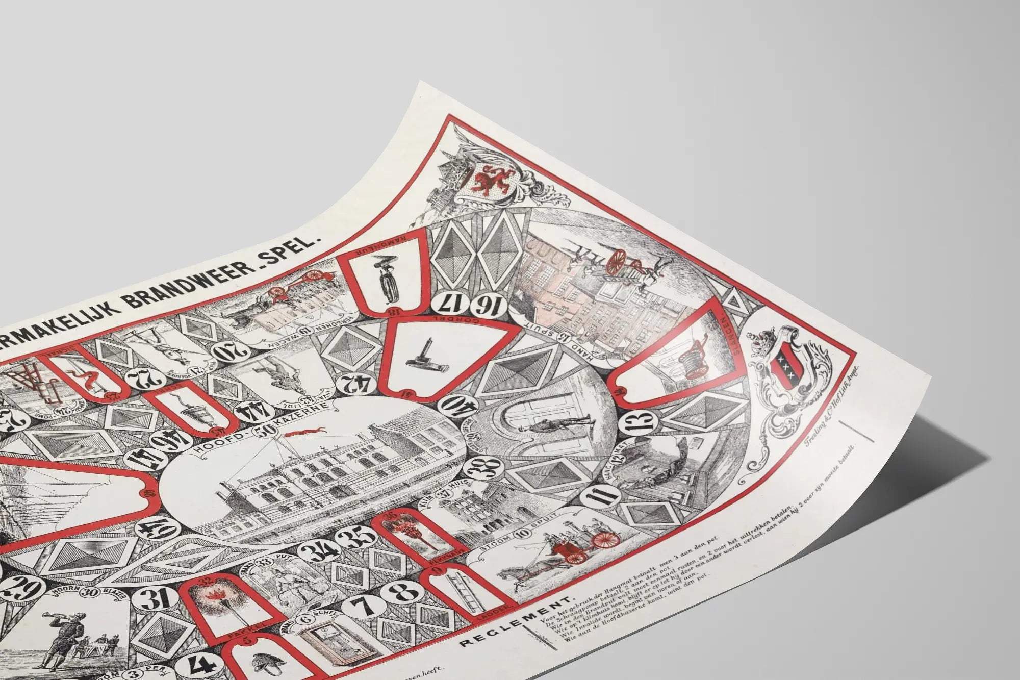 Découvrez cette affiche vintage représentant le jeu de société « Nieuw Vermakelijk Brandweer Spel », un poster original centré sur le thème de la brigade des pompiers. Cette décoration murale se distingue par son esthétisme rétro et son style graphique noir et blanc ponctué de touches de rouge, apportant un charme ancien unique à tout intérieur. Les illustrations détaillées mettent en avant différents éléments en lien avec les pompiers, notamment des véhicules, des équipements comme des casques, des trompettes, une lance à incendie, ainsi que des scènes d’intervention et des bâtiments liés à cette thématique. Ce tableau de jeu de société historique invite à la découverte et à l’évasion tout en renforçant une ambiance authentique et vintage dans votre espace. Parfait pour les amateurs de décoration murale thématique ou pour enrichir un espace dédié aux jeux de société ou à l’histoire des pompiers, ce poster vintage apporte une touche décorative originale et chargée de nostalgie. Son format carré et son impression sur papier lui confèrent un aspect graphique attrayant qui sublimera un mur de salon, de bureau ou de salle de jeux. Cette affiche est également idéale pour intégrer un style rétro ou industriel dans la décoration murale, grâce à ses couleurs sobres et son graphisme soigné. Une pièce rare et évocatrice qui plaira aux collectionneurs et passionnés d’histoire, tout en offrant une belle expression artistique ancienne autour des métiers des pompiers.