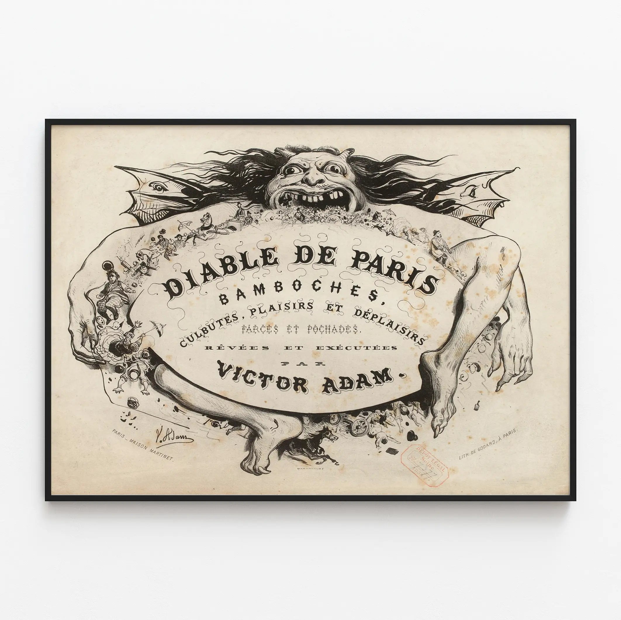 Cette affiche vintage intitulée « Diable de Paris » présente une illustration en noir et blanc, riche en détails et en imagination. Le dessin met en scène une grande créature anthropomorphe, dotée d’une expression saisissante, encadrant un texte décoratif. Autour de son corps apparaissent de nombreuses petites scènes animées, représentant des personnages en mouvement, des chevaux, des charrettes, ainsi que plusieurs figures surprenantes et burlesques. La composition artistique propose un mélange entre sculpture graphique et narration visuelle, capturant l'esprit des farces et des festins populaires, évoqués dans le texte central : « Bamboches, culbutes, plaisirs et déplaisirs, farces et pochades, rêvées et exécutées ». Ces mots renforcent l’ambiance carnavalesque et festive de l’œuvre, riche en intrigues et situations grotesques. Signée par Victor Adam, cette œuvre reflète un style ancien, typique des illustrations et lithographies parisiennes du XIXe siècle, parfait pour une décoration murale qui souhaite insuffler une touche d'histoire et de fantaisie. Cette affiche déco est idéale pour les amateurs d'art vintage et de pièces graphiques originales. En tant que décoration murale, ce poster vintage s'adaptera aux intérieurs qui recherchent une esthétique rétro, artistique et pleine d'esprit. Il s'intègre aussi bien dans un salon, un bureau créatif ou un espace dédié aux arts et à la culture. Ce tableau graphique invite à une découverte visuelle détaillée et engageante, chaque regard dévoilant des scènes nouvelles et amusantes. L’image offre ainsi une ambiance à la fois historique et ludique, qui stimule l'imagination et évoque le Paris festif et populaire d'autrefois. Ce poster déco unique complètera harmonieusement une collection murale dédiée aux affiches anciennes ou aux histoires illustrées. Par son style et son contenu, il constitue une pièce singulière et évocatrice destinée à enrichir tout espace de vie ou de travail par une touche d’originalité graphique et narrative.