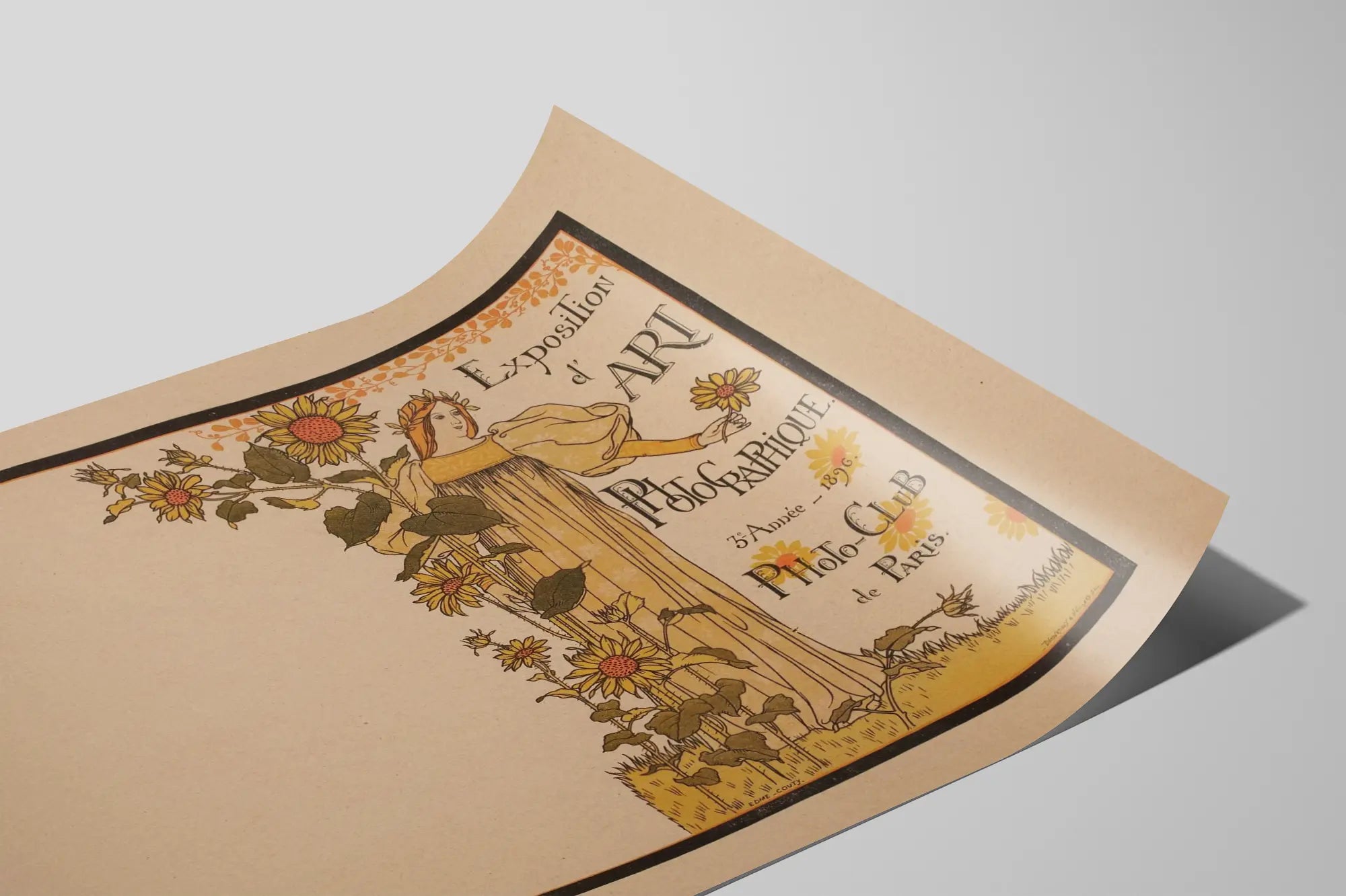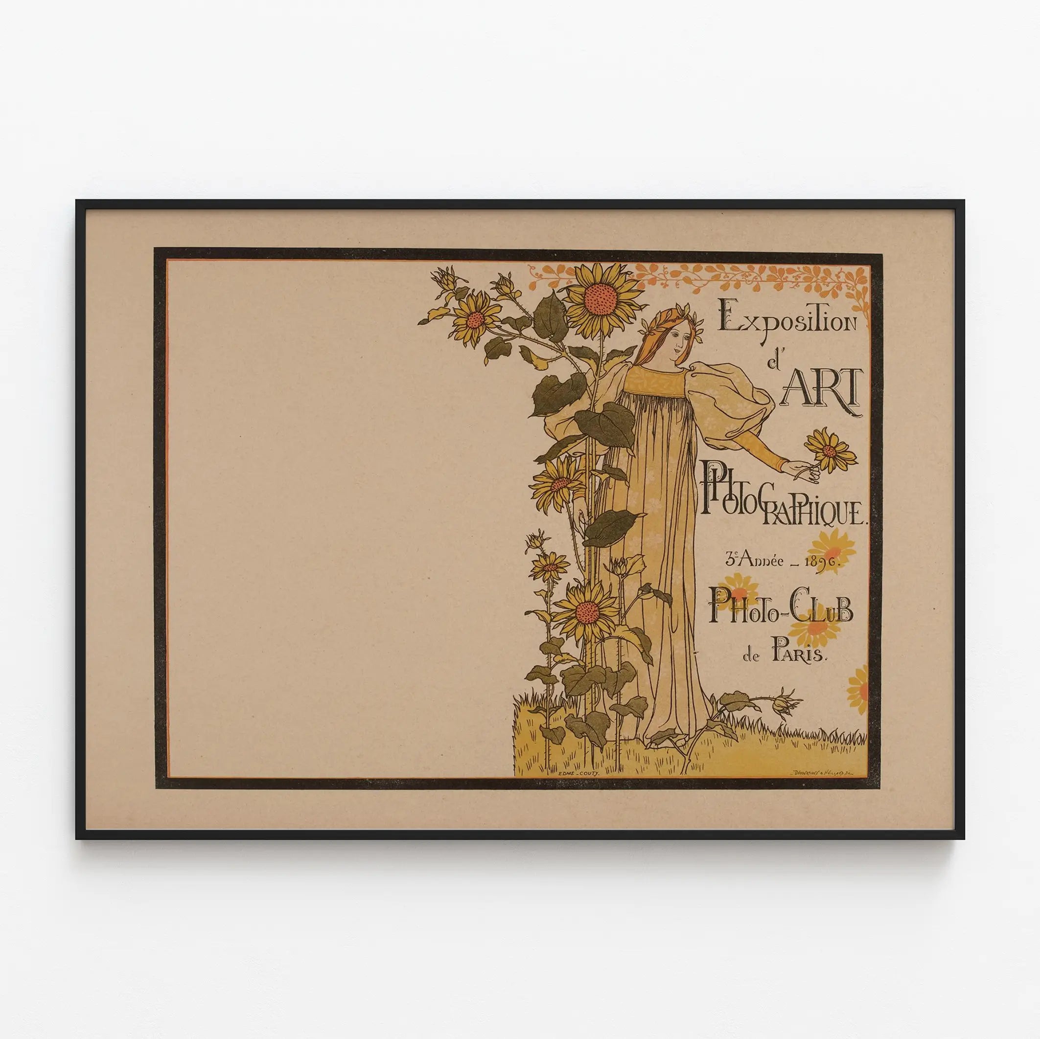 Découvrez cette affiche vintage emblématique de l'Exposition d'Art Photographique organisée par le Photo-Club de Paris lors de sa 3e année en 1896. Ce poster ancien allie esthétique Art Nouveau et design raffiné, avec une illustration délicate représentant une figure féminine élégante entourée de tournesols, symbole de lumière et de créativité. Parfaite pour une décoration murale originale, cette affiche apporte une touche historique et artistique à tout intérieur, qu'il soit classique ou contemporain. Cette pièce graphique unique évoque l'esprit des expositions artistiques du XIXe siècle, célébrant l'art photographique dans un cadre prestigieux. Les couleurs chaudes et naturelles, dominées par le jaune, l'ocre et le vert, mettent en valeur le dessin tout en conservant un charme rétro authentique. Elle constitue un choix idéal comme affiche déco pour les passionnés de photographie, d'histoire de l'art, ou simplement pour ceux qui souhaitent enrichir leur espace avec une œuvre murale au style vintage. Accrochez ce poster directement sur un mur dans votre salon, bureau ou salle d'exposition pour créer un point focal artistique et visuellement captivant. Cette décoration murale peut également être encadrée pour accentuer son élégance et protéger le papier. Son graphisme rappelant les arts décoratifs d'époque en fait un objet décoratif de choix pour les amateurs d'affiches anciennes et de posters d'art. En intégrant ce tableau mural dans votre collection, vous bénéficiez d'une œuvre qui incarne la passion pour l'art photographique et les clubs de création parisienne du XIXe siècle. Cette affiche d’exposition est parfaite pour enrichir un intérieur avec une histoire visuelle forte et un esthétisme soigné, valorisant ainsi votre décoration murale d'une touche d'authenticité et de culture.