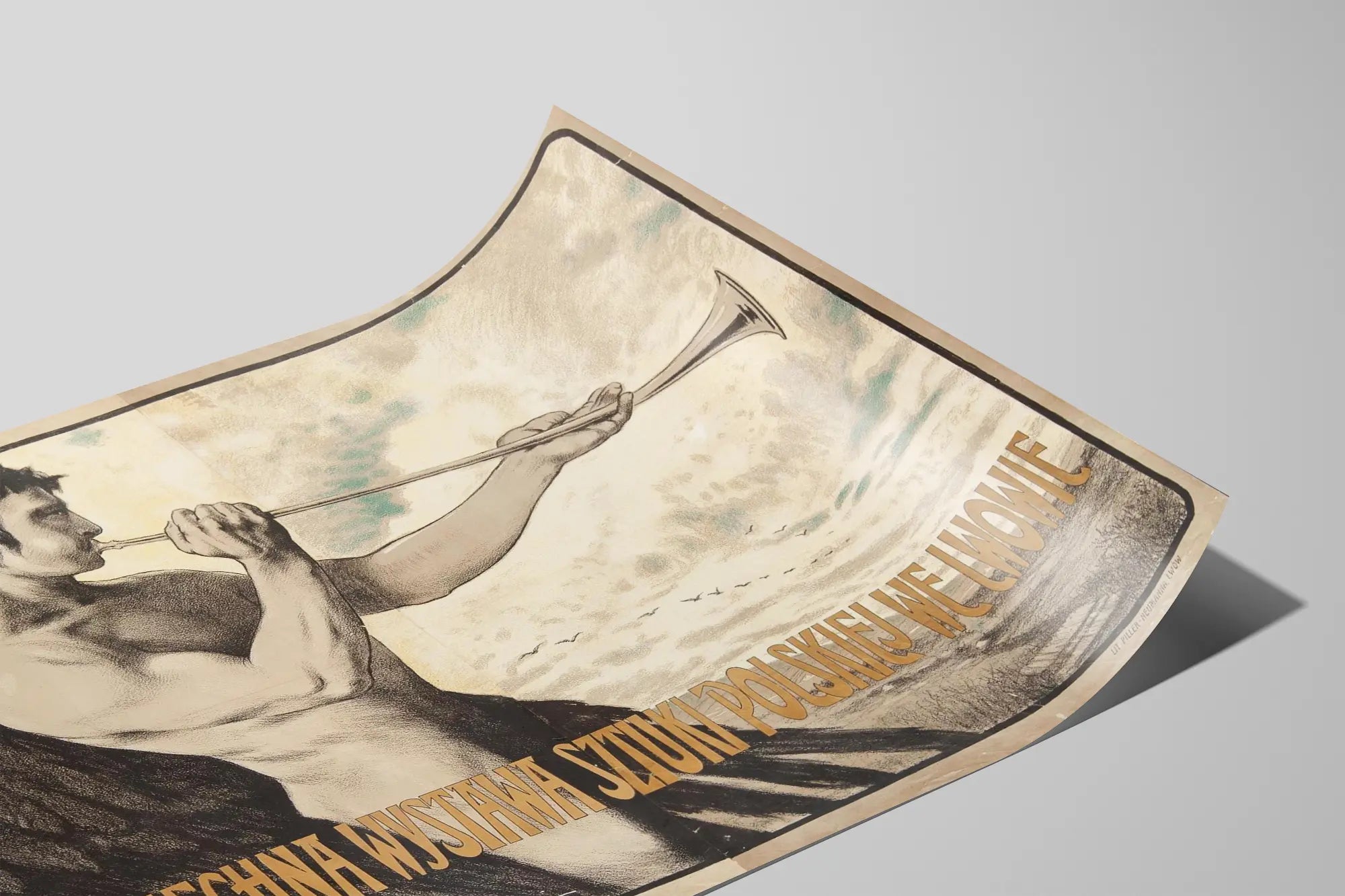 Cette affiche vintage présente une œuvre graphique remarquable mettant en scène un ange puissant soufflant dans une trompette longue, avec des ailes déployées et une couronne de lauriers sur la tête. Le style de l'illustration est minutieusement dessiné en nuances de noir et beige, offrant un rendu à la fois classique et évocateur. Ce poster est une véritable pièce de décoration murale pour les amateurs d'art et d'histoire. Portant l'inscription "Powszechna Wystawa Sztuki Polskiej we Lwowie", cette affiche commémore une exposition d'art polonais à Lwów, ville aujourd'hui connue sous un autre nom. Le design reflète l'esprit de cette manifestation artistique, avec une atmosphère chargée de symbolisme et une invitation à la découverte culturelle. Idéal comme décoration murale, ce poster antique apporte une touche d'élégance et de caractère à tout intérieur, que ce soit dans un bureau, un salon ou une galerie d'art. Sa palette sobre et ses dimensions généreuses permettent de l'intégrer harmonieusement dans des styles variés, du classique au contemporain. Cette affiche est aussi une pièce à collectionner, témoignant d'un moment clé pour l'art et la culture polonaise. Elle séduira tous ceux qui cherchent à enrichir leur décoration avec une affiche murale originale et chargée de sens historique. Offrez-vous ce tableau décoratif unique aux lignes affirmées et au message artistique fort, pour sublimer vos murs avec une note d'authenticité et de raffinement.