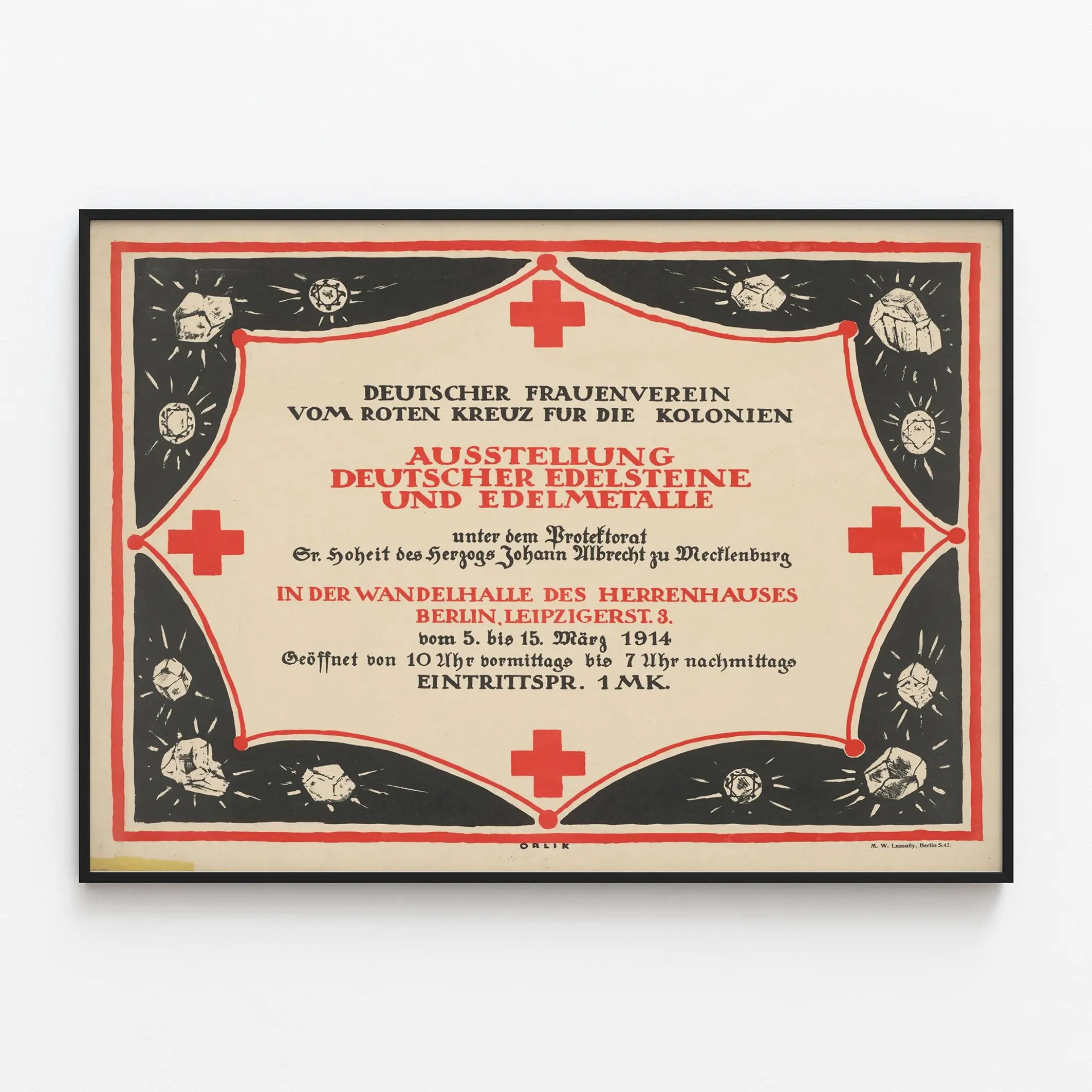 Cette affiche vintage, en allemand, annonce une exposition consacrée aux pierres précieuses et métaux précieux allemands, organisée par l'Association des femmes allemandes de la Croix-Rouge pour les colonies. Le texte est disposé au centre de la composition, encadré par un décor géométrique en noir et rouge avec des croix rouges et des illustrations stylisées de pierres précieuses éclatantes. Le cadre rouge vif et noir crée un contraste saisissant qui attire le regard vers le centre, mettant en avant les informations principales de l'exposition. Cette affiche, qui date vraisemblablement du début du XXe siècle, annonce l'événement qui a eu lieu à Berlin, plus précisément dans la Wandelhalle du Herrenhaus, une salle de réception. Les dates données, du 5 au 15 mars 1914, indiquent une importante manifestation culturelle et commerciale autour des gemmes et métaux précieux, sous la protection d'une haute autorité, mentionnée comme Son Altesse le duc Johann Albrecht de Mecklenburg. Une affiche comme celle-ci est une pièce maîtresse dans une décoration murale vintage ou retro, apportant une touche d'authenticité et d'histoire. Elle est idéale pour les passionnés d'art graphique ancien, de décorations murales à thème historique, ou pour toute collectionneur d'affiches d'expositions. Ce poster contribue à créer une atmosphère élégante et raffinée dans un salon, un bureau ou une galerie, en valorisant un style graphique typique de la période pré-Première Guerre mondiale. C'est un support visuel riche qui raconte une histoire liée à la culture allemande et à ses expositions industrielles et artistiques, tout en dévoilant une esthétique graphique marquante, mêlant la sobriété du noir avec la force du rouge et le symbolisme de la Croix-Rouge. Cette pièce est alors une décoration murale parfaite pour ceux qui recherchent un objet à la fois décoratif et porteur d'une histoire visuelle forte.
