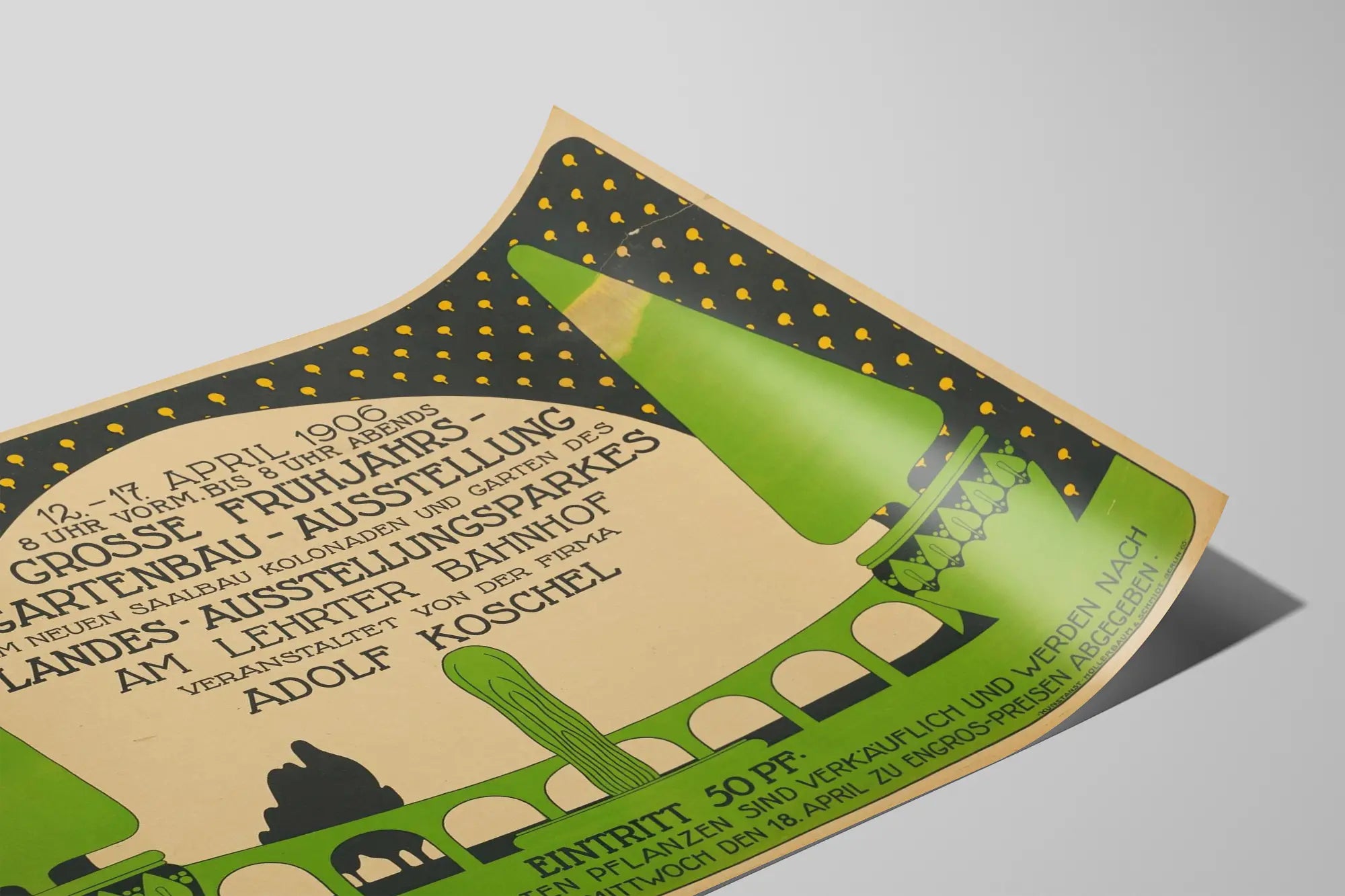 Cette affiche vintage annonce une grande exposition de jardinage printanier qui s'est tenue du 12 au 17 avril 1906. Elle invite les visiteurs à découvrir la "Grosse Frühjahrs-Gartenbau Ausstellung" au Landes-Ausstellungspak am Lehrter Bahnhof. Ce poster d'époque se caractérise par un design graphique classique avec des motifs végétaux stylisés en vert sur fond sombre ponctué de petits éléments jaunes. La composition met en avant deux grands conifères en pot et une fontaine centrale, symbolisant l'art du jardinage et le cadre décoratif de l'exposition qui avait lieu dans un nouvel édifice avec colonnades et jardins. Un texte en typographie historique précise les horaires d'ouverture de 8h du matin à 8h du soir ainsi que le nom du promoteur de l'événement, Adolf Koschel. Cette affiche de style ancien est une pièce de décoration murale idéale pour les amateurs d'histoire du jardin, d'arts graphiques et d'expositions anciennes. Elle apporte une touche rétro et authentique à tous les intérieurs, salons, bureaux ou espaces dédiés à la nature et à la culture horticole. Par sa rareté et son style, ce poster se distingue comme un tableau visuel représentant l'art du jardinage et les grandes manifestations florales du début du XXe siècle en Allemagne.