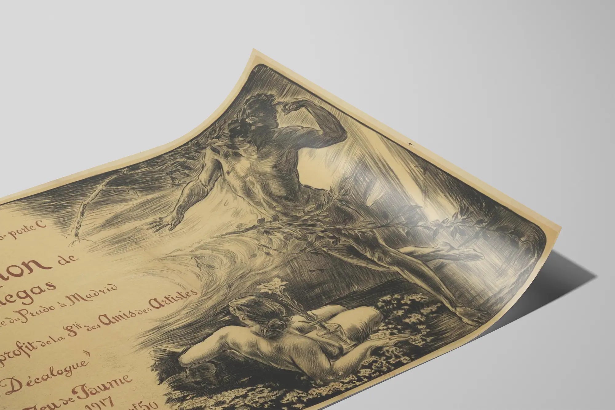 Découvrez cette affiche ancienne présentant l'exposition de José Villegas, alors directeur du Musée du Prado à Madrid. Cette affiche publicitaire réalise une mise en scène artistique avec deux figures humaines, l’une allongée et l’autre debout, entourées d’éléments naturels comme des feuillages et des fleurs. La composition met en valeur un style graphique évoquant l’Art Nouveau, avec des lignes fluides et un travail minutieux sur les ombres et les lumières, typique des affiches de la première moitié du XXe siècle. Ce poster d'exposition, imprimé en noir et sépia sur un fond beige patiné, constitue une pièce décorative murale d'exception, idéale pour embellir un intérieur avec une touche d'histoire de l'art et un aspect rétro élégant. Parfait pour les amateurs de décoration murale vintage, cet élément décoratif rappelle l'ambiance des grands événements artistiques du début du XXe siècle, tout en incarnant la richesse culturelle liée aux musées européens célèbres. Que ce soit dans un salon, un bureau ou une galerie, cette affiche apporte une atmosphère sophistiquée et artistique. Elle est une option originale pour créer une galerie murale inspirée des grandes expositions d'art historiques. Ce type de poster se marie harmonieusement avec différents styles d’intérieur, du classique revisité au contemporain, en offrant une narration visuelle autour de l’art et de ses acteurs. La typographie calligraphiée et l’illustration détaillée enrichissent l’esthétique de cette affiche et en font une décoration murale remarquable, digne des collectionneurs et passionnés d’art.