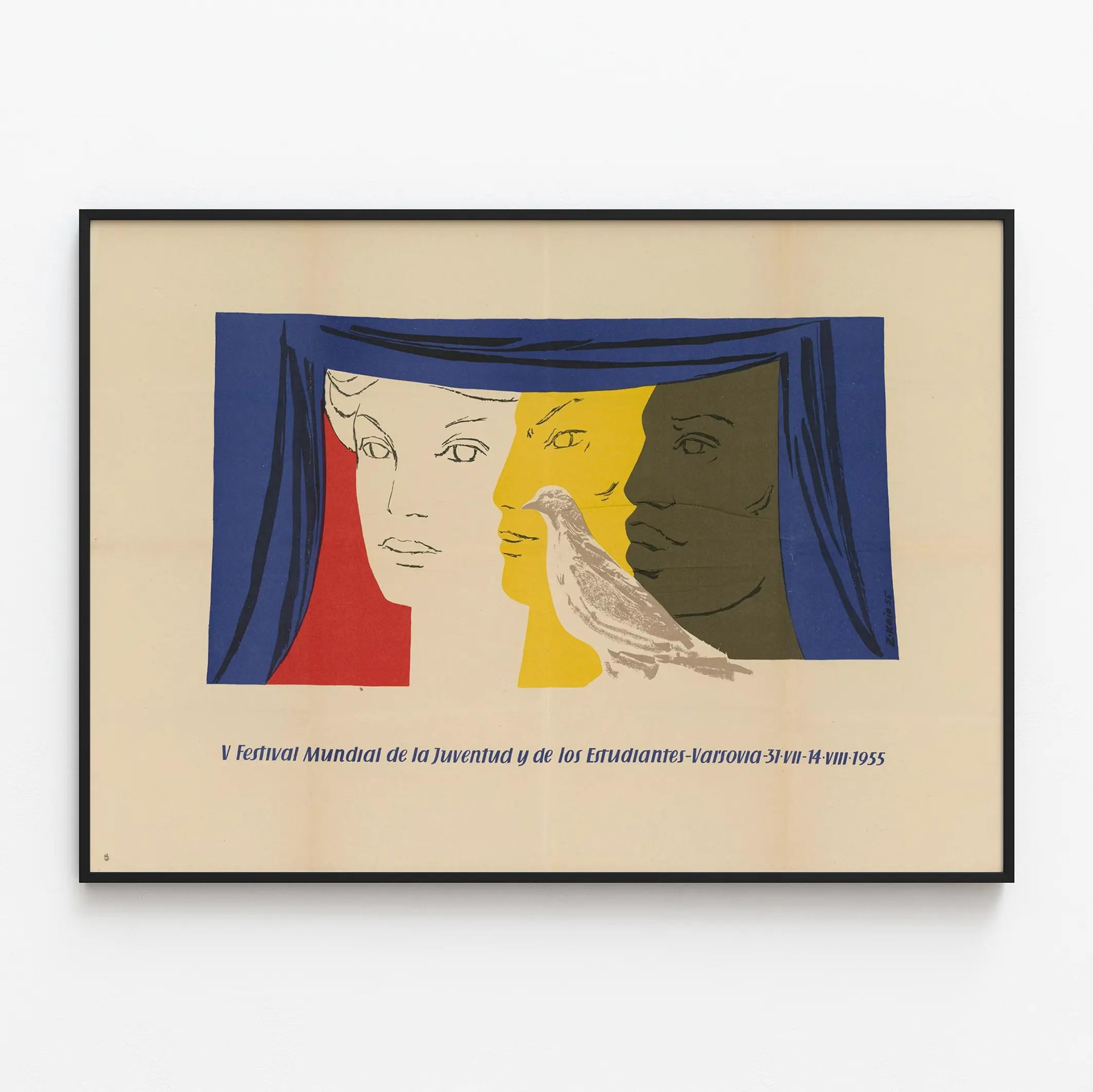 Cette affiche vintage iconique est une invitation artistique au V Festival Mundial de la Juventud y de los Estudiantes, tenu à Varsovie du 31 juillet au 14 août 1955. Véritable pièce de décoration murale, ce poster se distingue par son style graphique sobre et évocateur, associant trois profils humains aux teintes éclatantes rouge, jaune et vert olive, sous un rideau bleu profond. Au centre, la silhouette blanche d'une colombe symbolise paix et espoir, renforçant le message de rassemblement juvénile et d'unité mondiale. Ce tableau mural est un excellent choix pour enrichir un espace de vie ou de travail avec une touche d'histoire et de culture, tout en apportant un accent coloré et symbolique. Les traits délicats et minimalistes des visages, en contraste avec les aplats de couleur, confèrent à cette affiche une esthétique à la fois vintage et moderne, idéale pour une décoration murale raffinée. Que ce soit dans un salon, un bureau ou une bibliothèque, ce poster s’inscrit harmonieusement dans un décor éclectique ou rétro. Vous apprécierez le charme authentique d’un visuel imprimé en 1955, destiné à célébrer la jeunesse étudiante mondiale. Cette affiche est non seulement un élément décoratif, mais aussi une pièce d'art graphique qui évoque des valeurs fortes à travers son iconographie et ses choix chromatiques. Parfait pour les amateurs d'affiches historiques et les passionnés de décoration murale insolite, ce poster vintage enrichira votre intérieur avec son message universel de paix et de solidarité internationale.