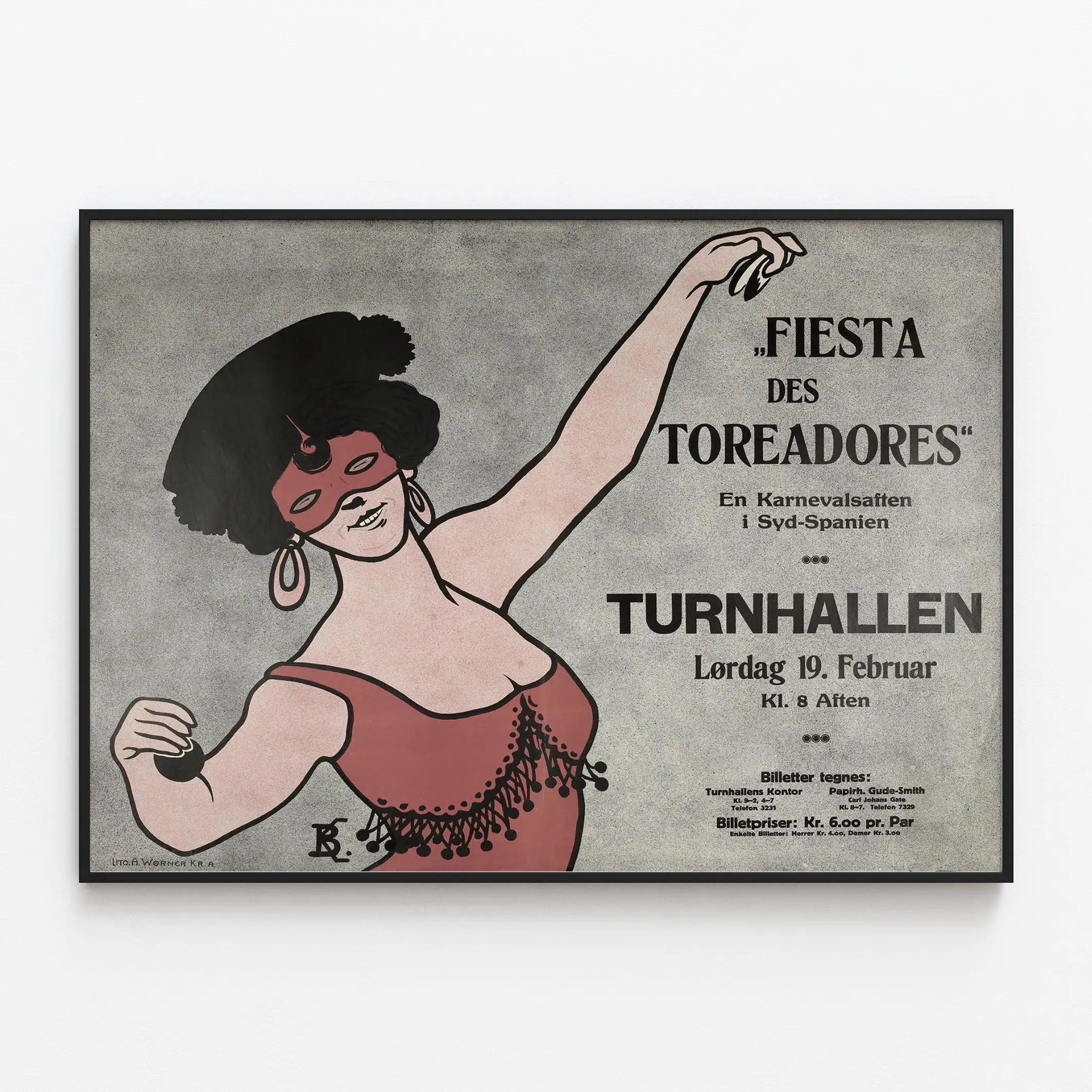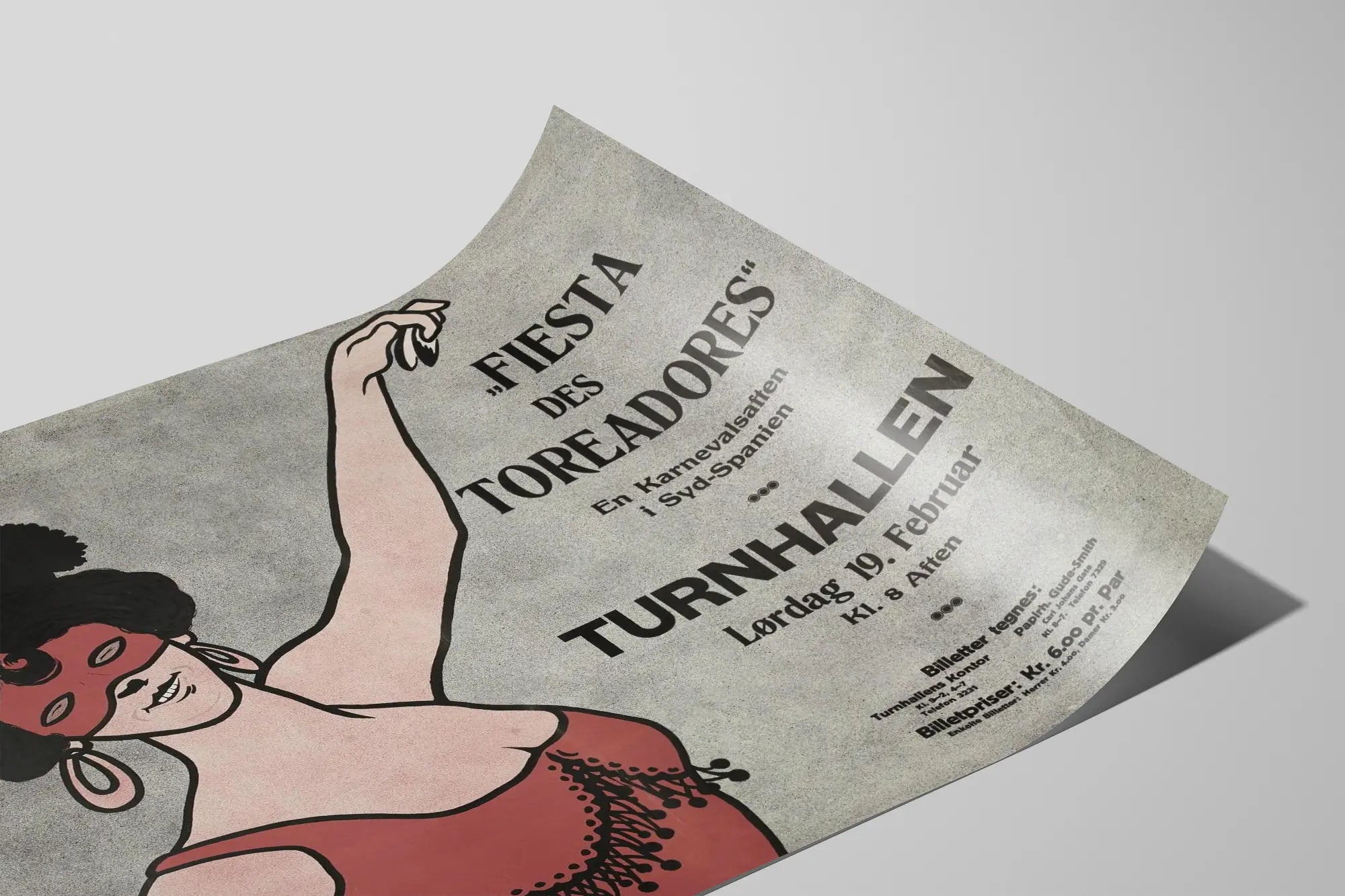 Cette affiche vintage représente une femme costumée lors de la "Fiesta des Toreadores", une fête de carnaval dans le sud de l'Espagne. L'illustration met en avant une danseuse portant un masque rouge distinctif, des boucles d'oreilles pendantes et une coiffe caractéristique, avec un costume festif aux détails travaillés. La composition graphique utilise des couleurs sobres et un style rétro qui rappelle les affiches de spectacles traditionnels. Ce poster vintage est idéal pour une décoration murale apportant une touche d'authenticité et d'ambiance festive inspirée des fêtes populaires espagnoles. Son design évoque les célébrations joviales et les carnavals, parfait pour habiller un intérieur à la recherche d'éléments culturels et artistiques. Que ce soit pour un salon, un bureau ou une salle de réception, ce tableau mural saura capter les regards par son charme historique et son style unique. L'affiche est également intéressante pour les amateurs de décoration murale thématique, autour des thèmes de la danse, du carnaval ou de la culture méditerranéenne. Optez pour ce poster à l'esthétique vintage afin de personnaliser votre espace avec une pièce originale, qui raconte une histoire festive et pleine de vie.