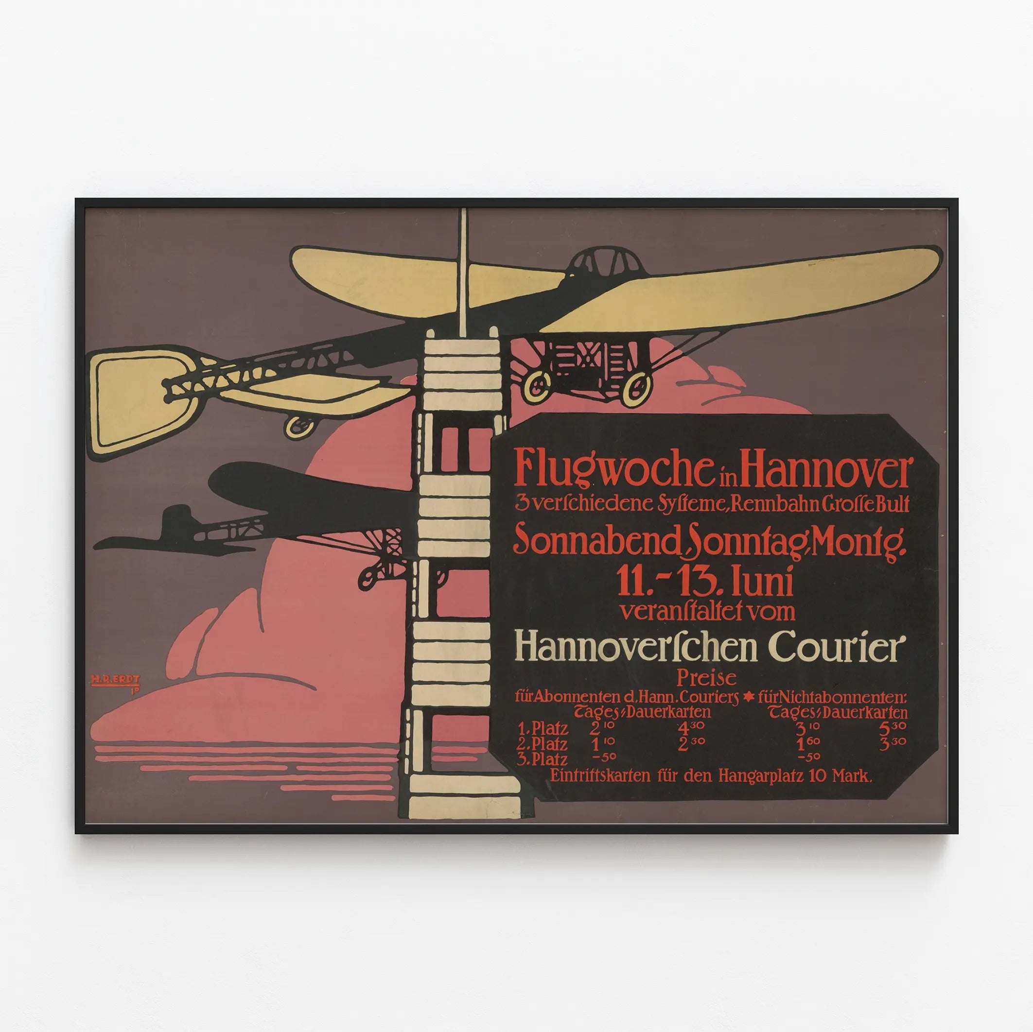 Affiche vintage Flugwoche à Hanovre - Avions et tour de contrôle