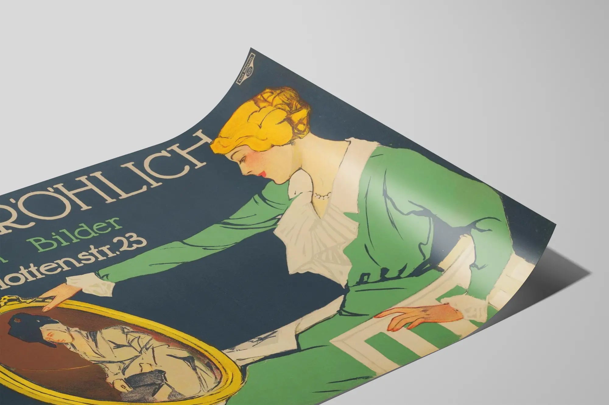 Cette affiche vintage Gebr. Rohlich met en valeur la décoration murale avec un style ancien et élégant. Représentant une femme en robe verte tenant un cadre doré aux contours bien dessinés, cette affiche illustre l'art des cadres et images décoratives, parfait pour tout amateur de décoration murale rétro. La femme, vêtue d'une robe verte ornée d'un col et de poignets blancs, attire l'attention sur le cadre qu'elle présente, où l'on aperçoit un portrait classique dans des teintes sobres. Le fond sombre met en avant les couleurs contrastées du personnage et du cadre, accentuant le côté esthétique et artistique de l'affiche. Le texte en haut, avec une typographie traditionnelle, annonce "GEBR. RÖHLICH Rahmen Bilder" (cadres images) et indique une adresse sur Charlottenstr. 23, suggérant un lieu dédié à la vente ou la promotion de cadres et d'œuvres murales. Cette affiche est une excellente idée pour décorer un intérieur avec une touche vintage, ajoutant une ambiance chaleureuse et artistique. Elle peut s'intégrer parfaitement dans un salon, une galerie ou tout espace à la recherche d'une décoration murale originale. Les amateurs de posters anciens et de peintures trouveront ici une pièce qui évoque le charme des années passées, avec une graphie soignée et une composition visuelle harmonieuse. Elle capture l'essence du design d'affiches publicitaires anciennes, un univers où l'image et le texte se combinent pour un impact visuel fort. Parfaite pour enrichir une collection d'affiches murales ou pour apporter une note d'authenticité à une pièce, cette affiche représente aussi une invitation à redécouvrir la beauté des cadres traditionnels et des images artistiques dans un contexte décoratif. Que ce soit pour un usage personnel ou professionnel, ce poster offre une inspiration pour la décoration murale classique, alliant art et histoire dans un format visuel attrayant et accessible.