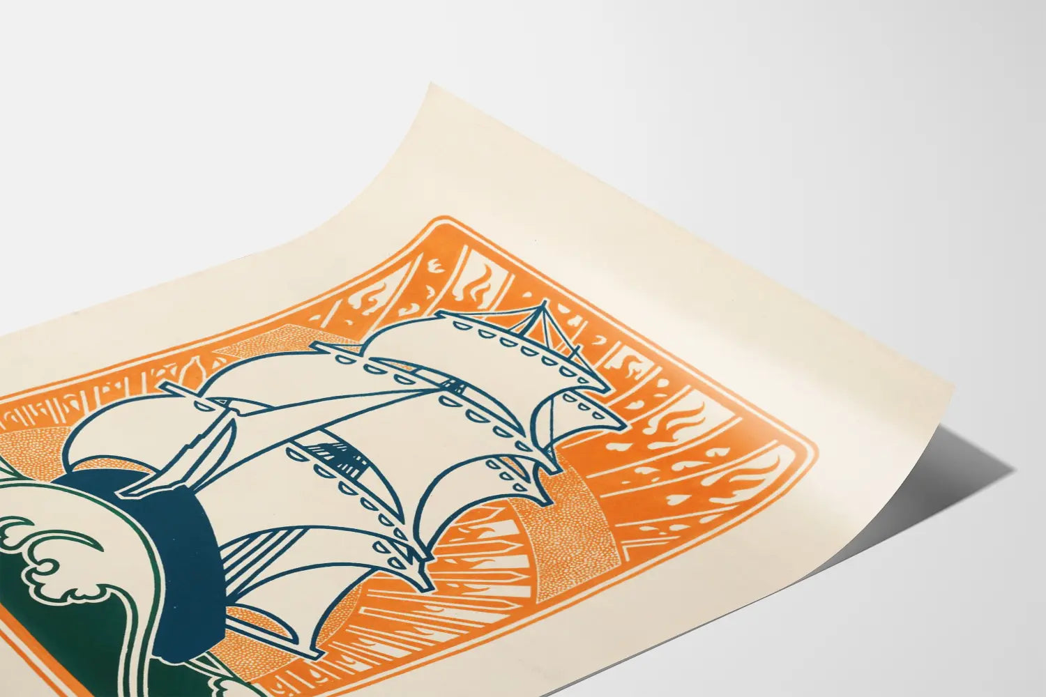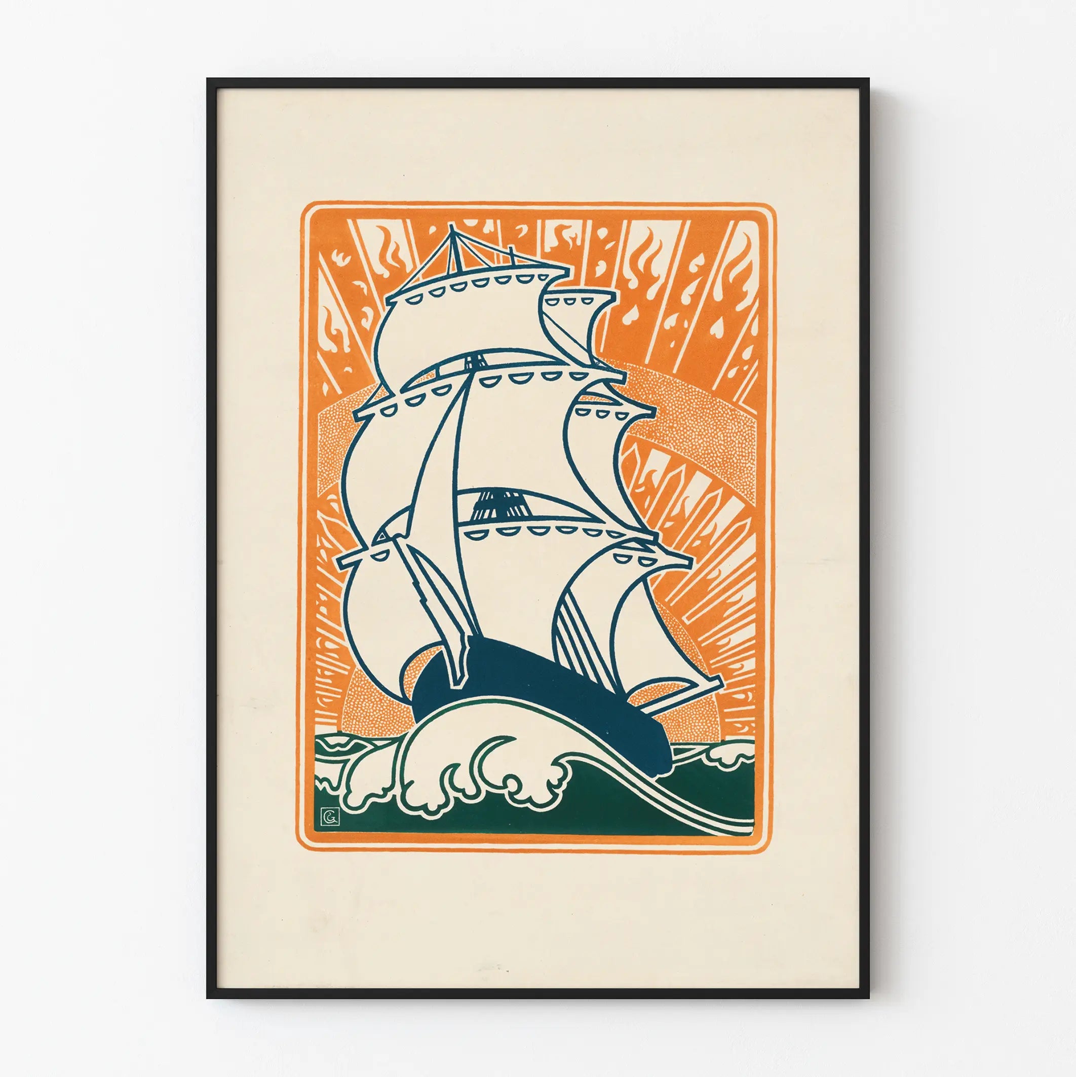 Denna dekorativa affisch föreställer en stor stiliserad segelbåt på öppet hav, med sina vita segel utbredda och kontrasterande vackert mot en livfull orangehimmel som påminner om en solnedgång vid horisonten. Grafiken, typisk för art déco-stilen, använder rena linjer och geometriska former som framhäver elegansen och dynamiken hos fartyget. De rullande vågorna i förgrunden, tecknade i mörkgrönt, understryker rörelsen och kraften hos denna stora segelbåt som möter elementen. Denna väggposter är perfekt för att tillföra en vintage- och maritim känsla till ett rum. Dess rammade format och varma färger gör den till en väggdekoration som enkelt passar in i ett modernt eller klassiskt inrett hem, oavsett om det är i ett vardagsrum, sovrum eller kontor. Denna marina affisch hyllar den tidlösa charmen hos de stora havsöverfarterna, idealisk för navigationentusiaster, grafiska konstälskare eller de som söker en lugn och inspirerande atmosfär. Genom att lägga till denna tavla på dina väggar bjuder du in en ljus och äventyrlig stämning, samtidigt som du kompletterar din samling av affischer med ett förfinat och originellt verk. Denna dekorativa poster kommer att förhöja dina utrymmen genom att ge dem en stark och äkta identitet, färgad av havets romantik och resandets äventyr. Gör detta konstnärliga tryck till en nyckelkomponent i din väggdekoration för att framkalla friheten och skönheten i det öppna havet.