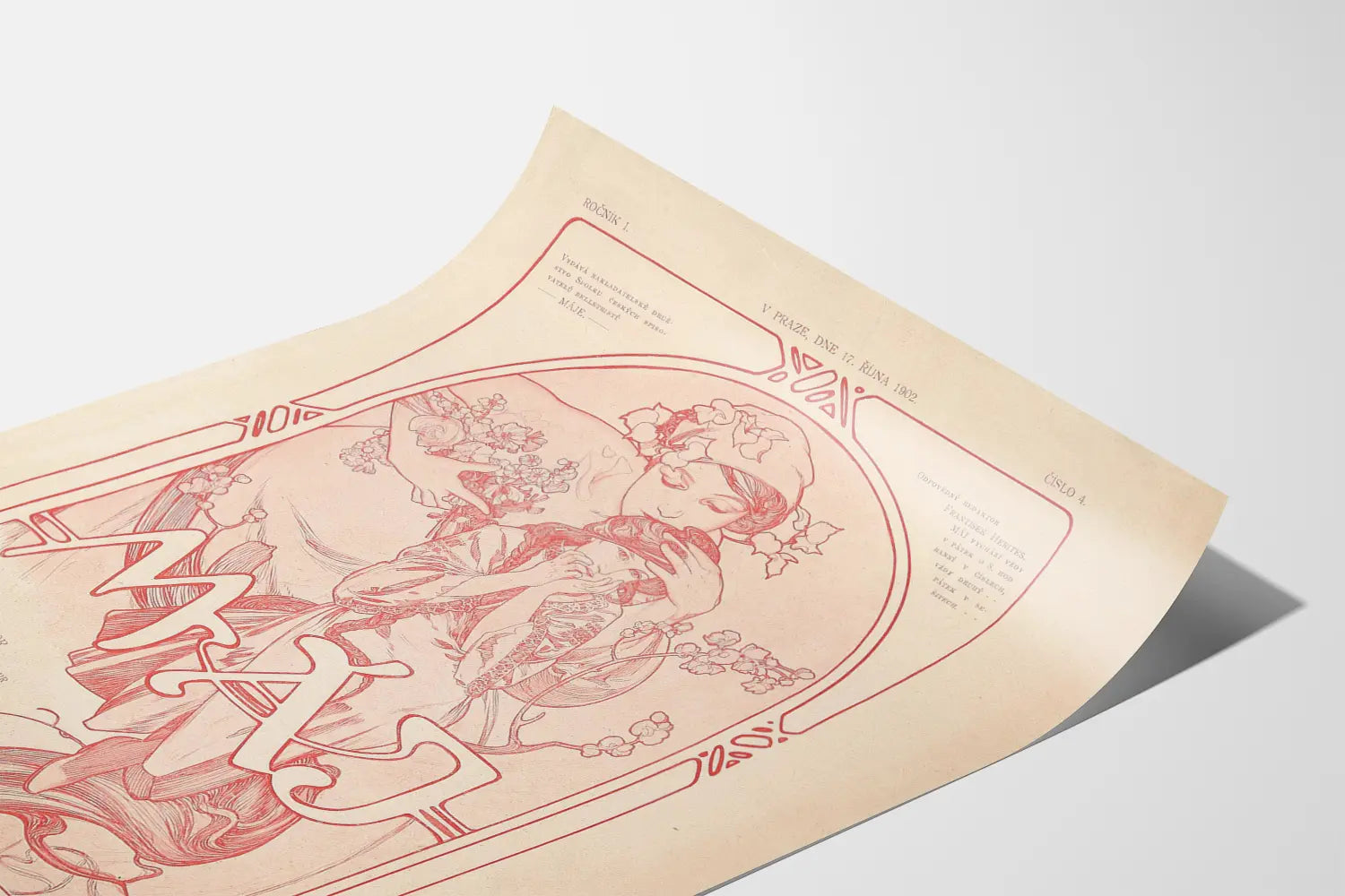 Den vintageaffisch MÁJ 1902 ger en elegant och historisk prägel till varje väggdekoration. Ursprungligen från 1902, illustrerar den en typisk Art Nouveau-stil med sina böljande linjer och delikata blomstermotiv. Teckningen, utförd i röda nyanser på en beige bakgrund, föreställer två kvinnliga figurer omgivna av blommor, och förkroppsligar en mild och poetisk atmosfär. Verket väcker en känsla av ömhet och lugn, perfekt för ett inre som vill kombinera äkthet och förfining i sin inredning. Som väggposter är denna affisch idealisk för att dekorera ett vardagsrum, ett kontor eller ett bibliotek, och tillför en tidsenlig atmosfär som påminner om början av 1900-talet. Dess utsmyckade ram och gamla typografi gör detta konstverk till en unik väggdekoration, både konstnärlig och kulturell. Detta pappersmålning kan harmoniskt integreras i en retro- eller vintageinredning, och lyfter fram grafiska detaljer och den klassiska estetiken. Oavsett om det är för en konstsamlar eller en inredningsentusiast som söker en originell affisch, är denna utgåva av MÁJ från 1902 ett vackert exempel på Art Nouveau i väggdekorationer. Dess tidlösa utseende inbjuder till lugn och eftertanke, och gör denna affisch till ett fullvärdigt väggdekorationselement. Välj detta konstverk för att berika ditt utrymme med en historisk konstnärlig prägel, en symbol för tryck- och illustratörskonst från en svunnen tid, men fortfarande mycket uppskattad inom inredning. Ett perfekt val för att ge karaktär och djup till dina väggar med en affisch som har en oemotståndlig charm.