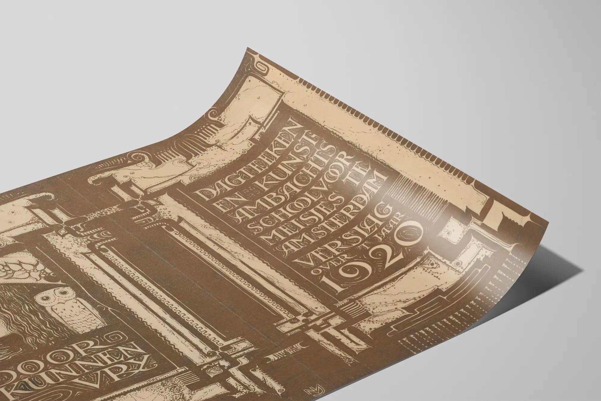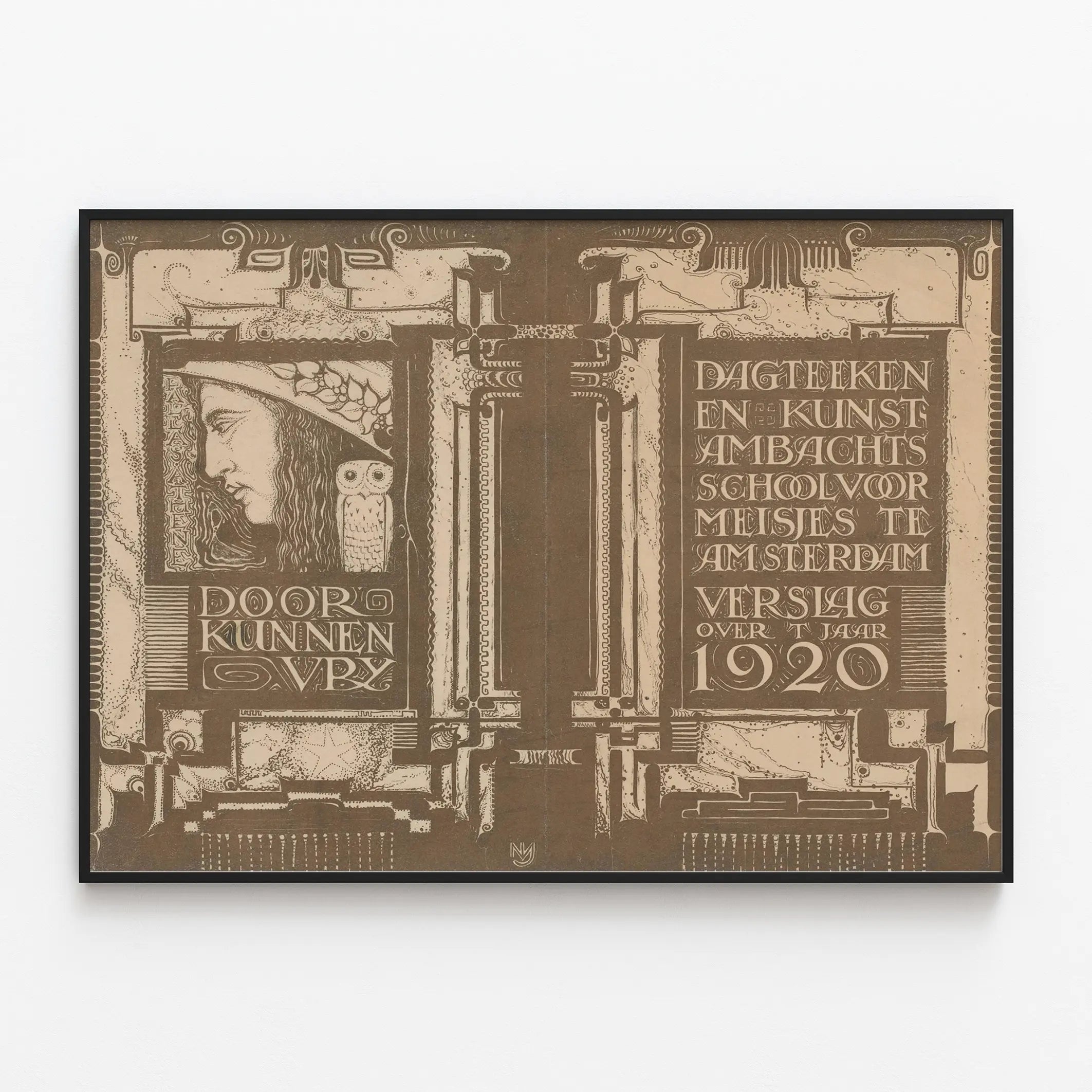Denna affisch i jugendstil kännetecknas av sin detaljerade och omsorgsfulla grafik, typisk för början av 1900-talet. Den föreställer ett profilansikte med hatt, bredvid en stiliserad uggla, och väcker tankar om visdom och kreativitet. Den hänvisar till Konst- och yrkesskolan för flickor i Amsterdam och bär anteckningen om en årsrapport för år 1920. Denna dekorativa affisch är perfekt för entusiaster av vintagekonst, historiska konstskolor och väggdekorationer i retrostil. Med sina organiska linjer och geometriska mönster fångar den perfekt andan av illustration och design från 1920-talet. Använd som väggdekoration ger denna affisch en touch av elegans och kultur till ett hem, oavsett om det är modernt eller klassiskt. Perfekt att hänga i vardagsrummet, på kontoret eller i biblioteket, och blir ett unikt föremål att visa upp, lockande med sin estetiska charm och visuella historia. Denna grafiska tavla inbjuder till upptäckten av tillämpad konst och tidsenlig design, och tillför äkthet och djup till ditt utrymme. Idealisk för alla som vill integrera ett stiliserat verk i sin samling av affischer eller väggdekorationer inspirerade av de konstnärliga rörelserna från början av 1900-talet.