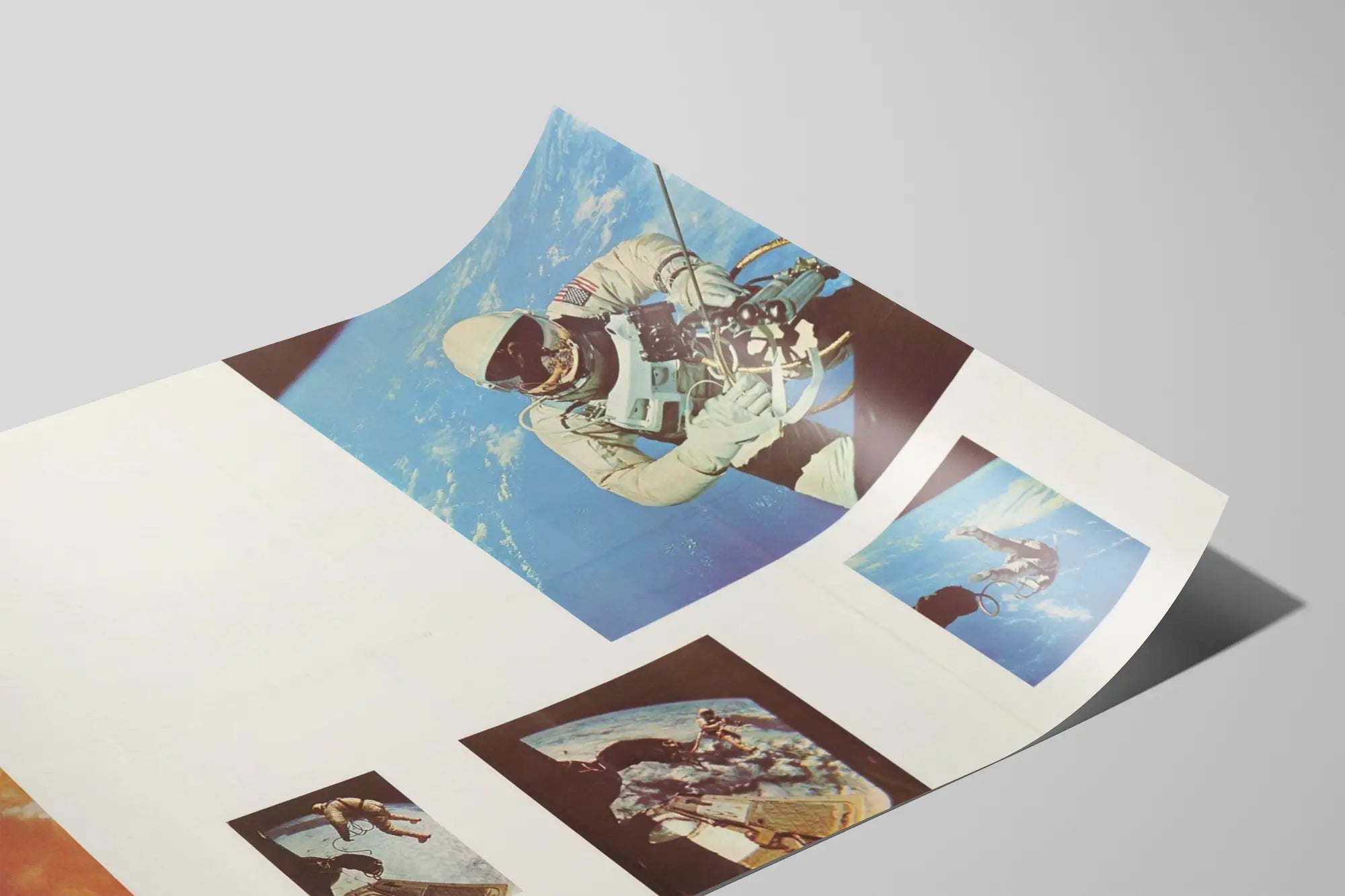 Denna väggaffisch utforskar det fascinerande temat för rymdforskning genom en serie slående fotografier. Dominerad av en bild av en astronaut i full utomkroppslig färd, fångar denna väggdekoration essensen av rymdutforskning, med silhuetten av astronauten svävande i det kosmiska tomrummet, jorden i bakgrunden som en tyst vittne. Astronautens dräkt är detaljerad, med synliga tekniska element som säkerhetskablar och instrument som är fastsatta, vilket understryker den vetenskapliga och äventyrliga aspekten av detta rymduppdrag. En annan stark del av denna komposition är den jordiska raketen i startfasen, med eld och rök som skjuter denna farkost mot omloppsbanan, vilket illustrerar den energi och kraft som krävs för att nå rymden. Flera små bilder visar astronauten som svävar nära sin rymdmodul, vilket avslöjar aspekten av livet i viktlöshet och komplexiteten i operationer i omloppsbana. Hela sammansättningen utgör en vacker visuell kombination av den teknologiska kraften hos en uppskjutare och den mänskliga sårbarheten i en utomjordisk färd. Denna affisch framstår som ett starkt inslag för ett modernt inre, som förenar vetenskap, äventyr och estetik. Som väggdekoration riktar den sig till astronomiintresserade, rymdhistorieentusiaster och alla som söker en touch av förundran och storhet i sina hem- eller arbetsutrymmen. Dess multiphoto-format möjliggör detaljrik uppskattning av varje scen samtidigt som det upprätthåller en visuell harmoni, perfekt för vardagsrum, kontor eller utrymmen för reflektion och kreativitet. Denna typ av affisch är perfekt för att inspirera unga upptäcktsresande och samlare av historiska bilder, och för med sig en aura av mod och upptäckarglädje. För en fängslande och originell väggdekoration fångar denna astronautaffisch i rymdpromenad andan av att erövra det oändliga, med dess risker och underverk.