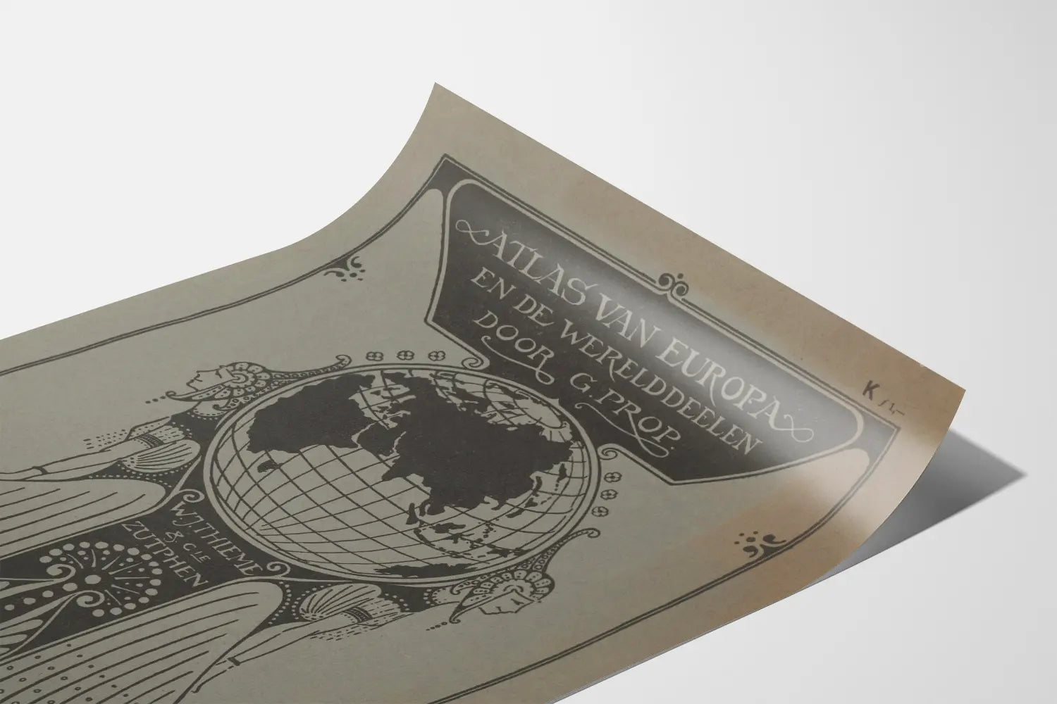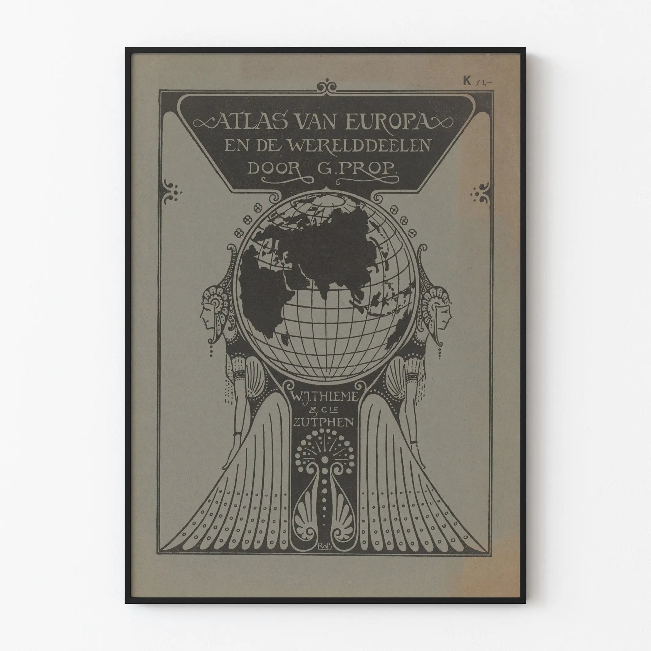 Den här vintageaffischen föreställer omslaget till Atlas över Europa och Kontinenterna, ett verk av G. Prop utgivet av W.J. Thieme & Cie i Zutphen. Den utgör ett unikt väggdekorationselement, perfekt för entusiaster av kartografi och historia. Designen framhäver ett stiliserat världskarta i svart på grå bakgrund, inramad av två kvinnliga figurer i art déco-stil, som sannolikt symboliserar stabilitet och visdom, vilket ger en konstnärlig och elegant touch till affischen. Texten på nederländska tydligt visar atlasens titel, vilket förstärker dess äkthet och ålder. Denna vintageaffisch kan användas som dekorativ poster i ett kontor, vardagsrum eller bibliotek, och skapar en atmosfär som är både kulturell och förfinad. Dess typografi och grafiska ornament betonar dess konstnärliga och antika karaktär, och passar perfekt in i ett klassiskt eller retro dekorativt universum. Genom sin geografiska framställning väcker den också en känsla av resa över kontinenterna, och väcker nyfikenhet och beundran för världen ur ett historiskt perspektiv. Oavsett om du söker en väggdekoration för ett europeiskt utrymme eller för ett tematiskt inre med fokus på geografi och resor, är denna affisch av G. Prop ett distinkt val. Den riktar sig till konstälskare och samlare av kartografiska föremål från äldre tider. Kvaliteten på grafiken och den visuella sammansättningen gör denna poster till ett tillgängligt och unikt väggdekorationselement, som kan lyfta vilken vägg som helst med en kulturell och estetisk prägel. Sammanfattningsvis representerar denna affisch av Atlas över Europa och Kontinenterna en perfekt förening av grafisk konst, kartografi och väggdekoration. Den kombinerar elegans, historia och modernitet i en sober och tidlös stil.