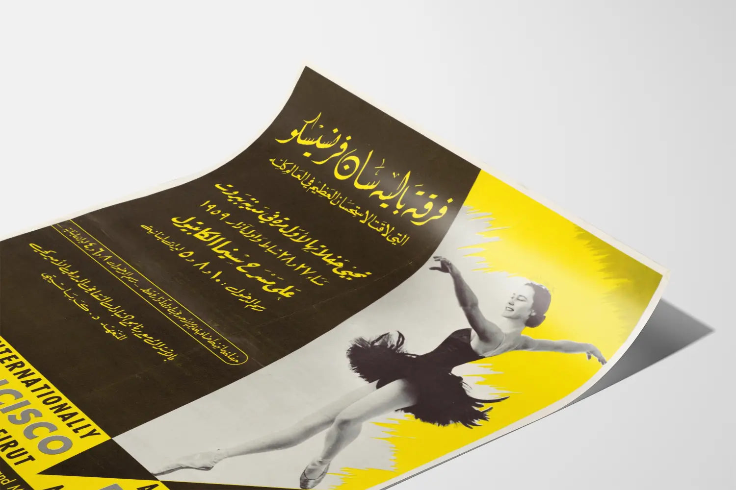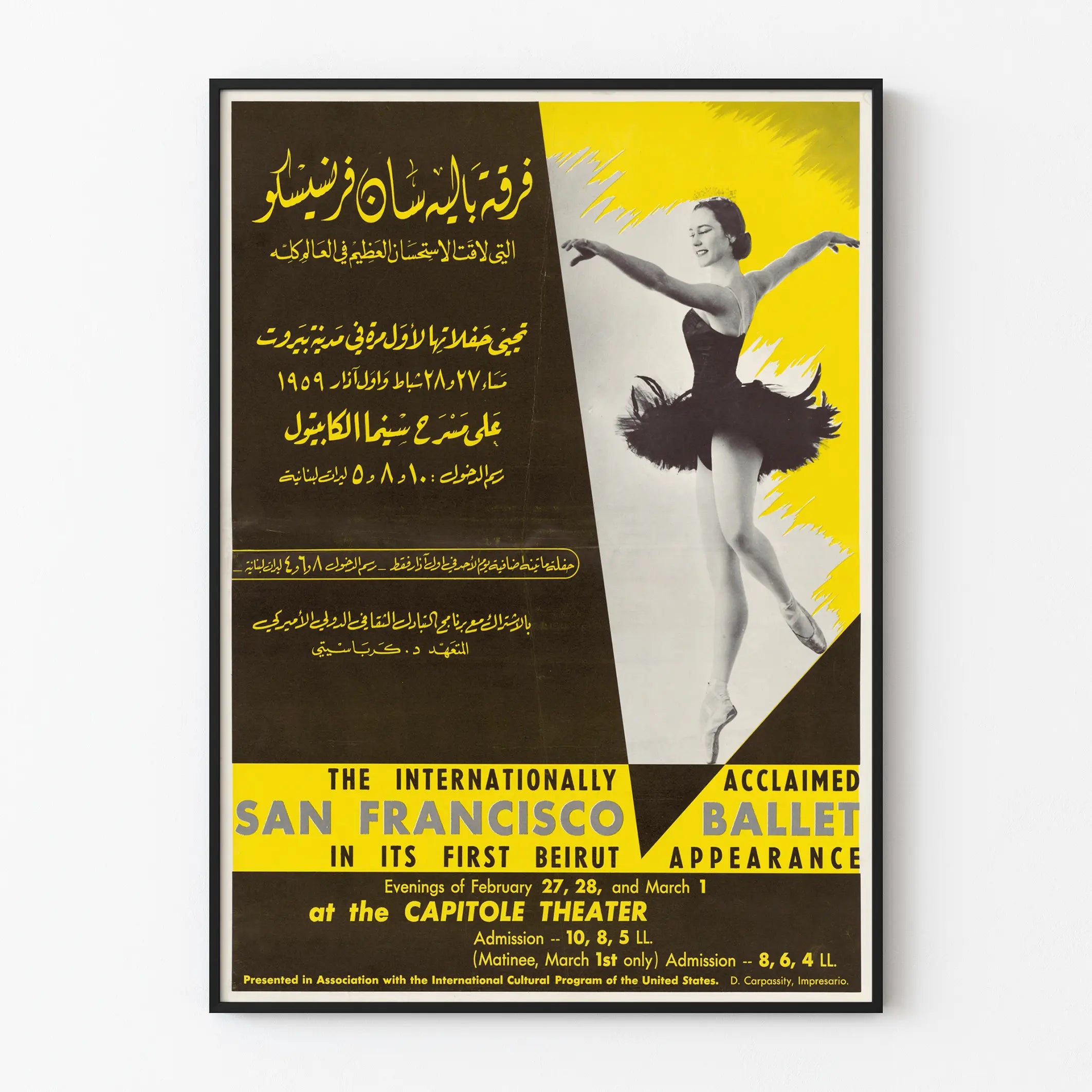 Detta väggbild är ett utmärkt val för dansentusiaster, fans av klassiska föreställningar eller för dem som uppskattar affischer i retrostil. Denna väggdekoration visar en perfekt balans mellan text och bild, med inskriptioner på engelska och arabiska som speglar det internationella kulturarrangemanget i Beiruts, på Capitolteatern, i slutet av februari och början av mars 1959.