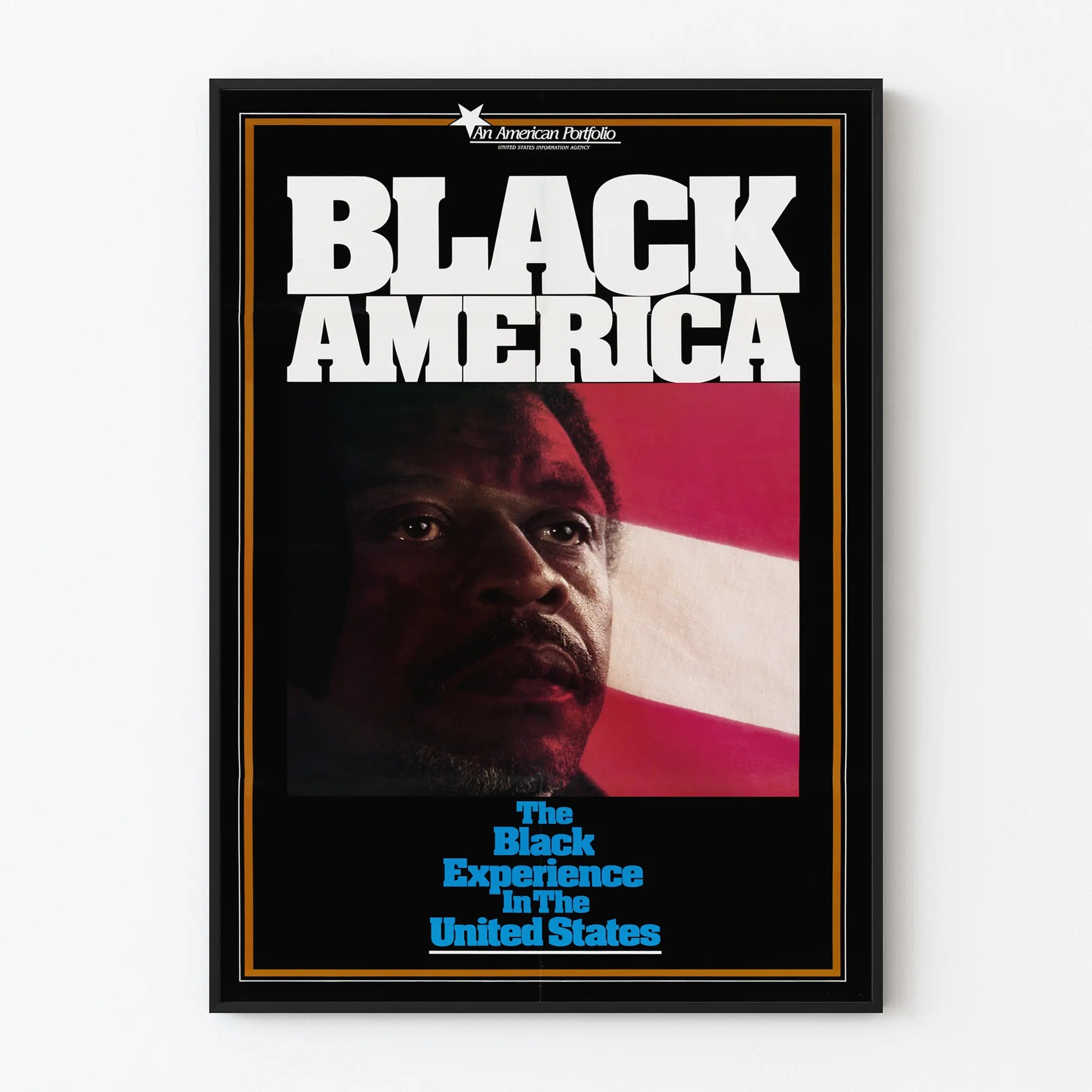 Den här affischen med titeln "Black America" erbjuder en stark och meningsfull skildring av den svarta erfarenheten i USA. Med ett uttrycksfullt närbildsporträtt av en svart man mot en bakgrund med intensiva färger som blandar rött och vitt, fångar denna väggdekoration omedelbart uppmärksamheten. Designen lyfter fram ett djupt budskap genom en slagkraftig text: "The Black Experience In The United States", skriven i blått på svart bakgrund, samt huvudtiteln i stora vita bokstäver. Denna affisch spelar på färgkontraster och den visuella sammansättningen för att understryka ett viktigt tema i det amerikanska samhället. Perfekt för att berika en inomhusvägg, riktar den sig till dem som vill uttrycka eller väcka medvetenhet om kulturella och sociala frågor genom en väggdekoration med stark symbolisk betydelse. Denna poster är ett kraftfullt dekorativt element som kan passa i ett vardagsrum, ett kontor eller ett utrymme för reflektion och samtal. Som ett dekorativt föremål utmärker den sig genom sin enkla men slagkraftiga grafiska stil, som tilltalar både konstälskare och entusiaster av historiska och sociala teman. Denna originella affisch möjliggör att lyfta fram ett inre rum samtidigt som den väcker en viktig fråga, och skapar en engagerad och djup stämning i rummet. Oavsett om den placeras i ett hem eller på en arbetsplats, utgör denna poster en väggdekoration som är både estetisk och meningsfull.