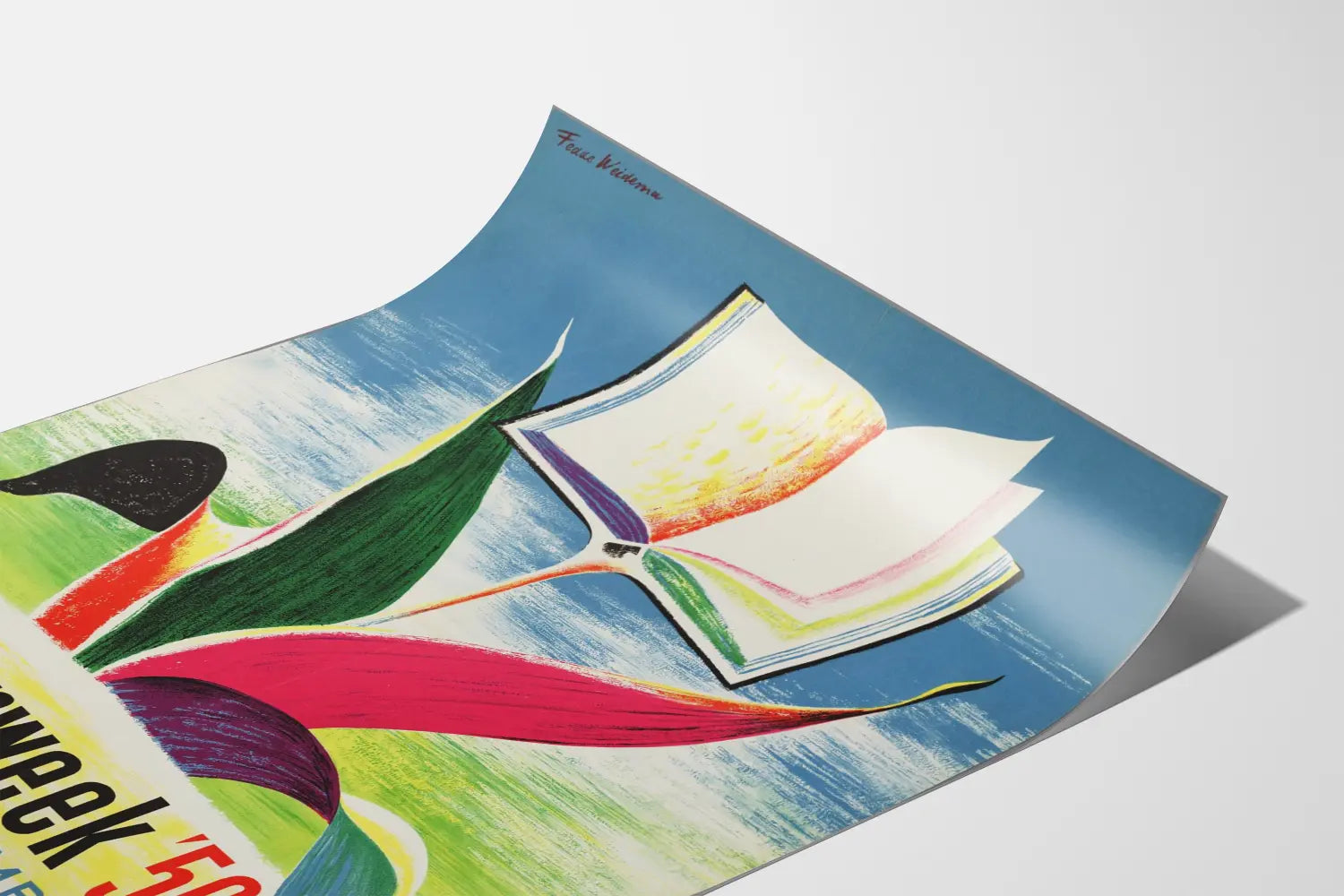 Den vintageaffisch för Boekenweek 1956 är en perfekt väggdekoration för litteraturälskare och retrokonstentusiaster. Designen visar en öppen bok som svävar ovanpå en stjälk, liknande en färgglad stiliserad blomma, vilket förenar natur och kultur i en poetisk och grafisk komposition. Den gradientbakgrund i blått och grönt samt de livfulla färgerna på bladen i rött, mörkgrönt, lila och svart förstärker den dynamiska visuella effekten av affischen.