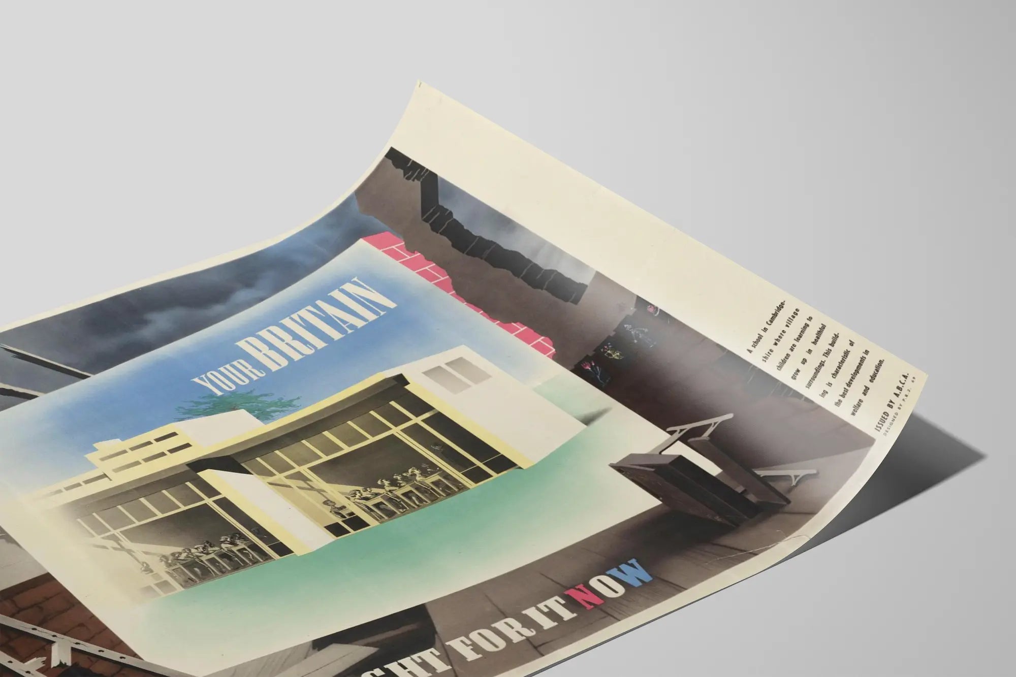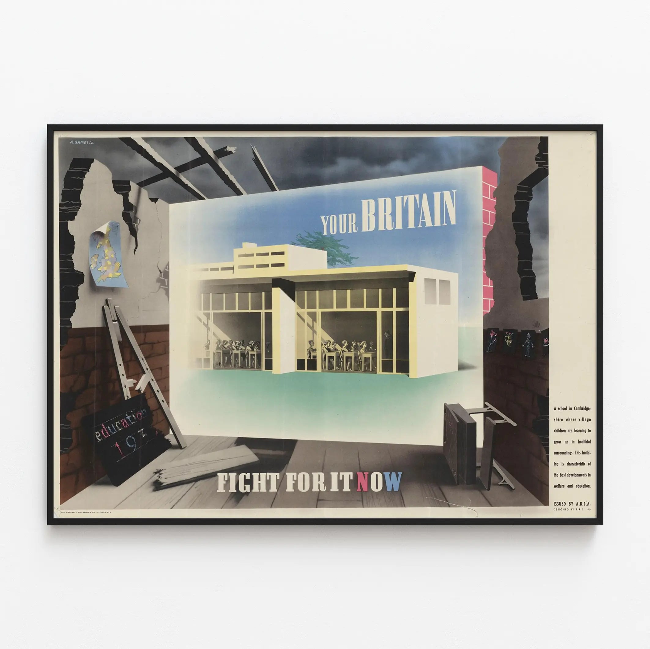 Den här vintageaffischen med titeln « Your Britain Fight For It Now » illustrerar en modern skola belägen i Cambridgeshire, och lyfter fram ett starkt budskap om utbildning och social utveckling. Föreställande ett ljust och funktionellt klassrum, framhäver denna poster framsteg inom välbefinnande och utbildning, och påminner om vikten av kvalitativa skolstrukturer i brittiska byar. Affischen kontrasterar skolans modernitet, där barnen sitter i rader under en tydlig kubisk arkitektur, mot en förfallen och mörk bakgrund i förgrunden, som symboliserar utmaningar och det brådskande behovet av att agera för att förbättra inlärningsvillkoren.