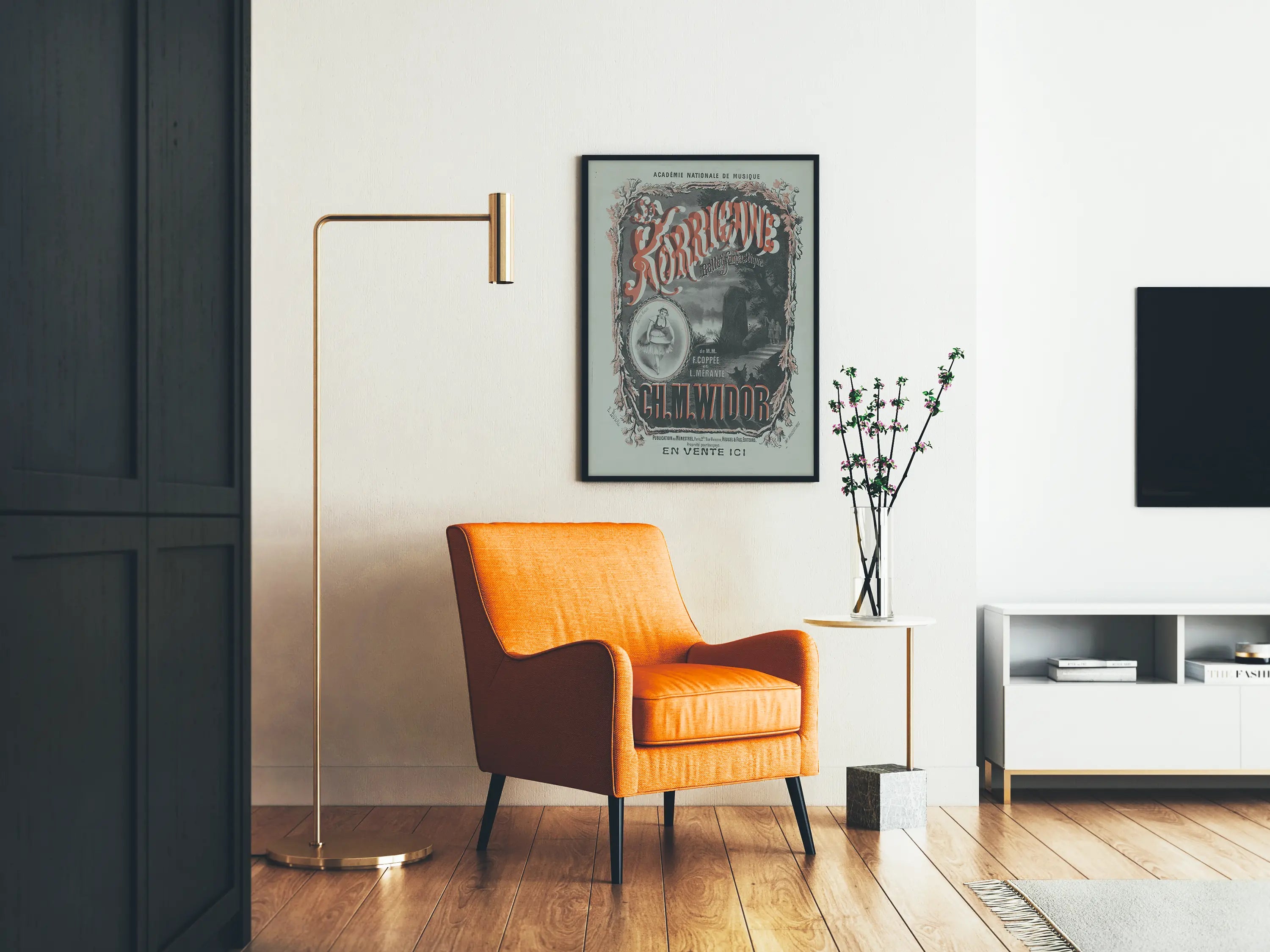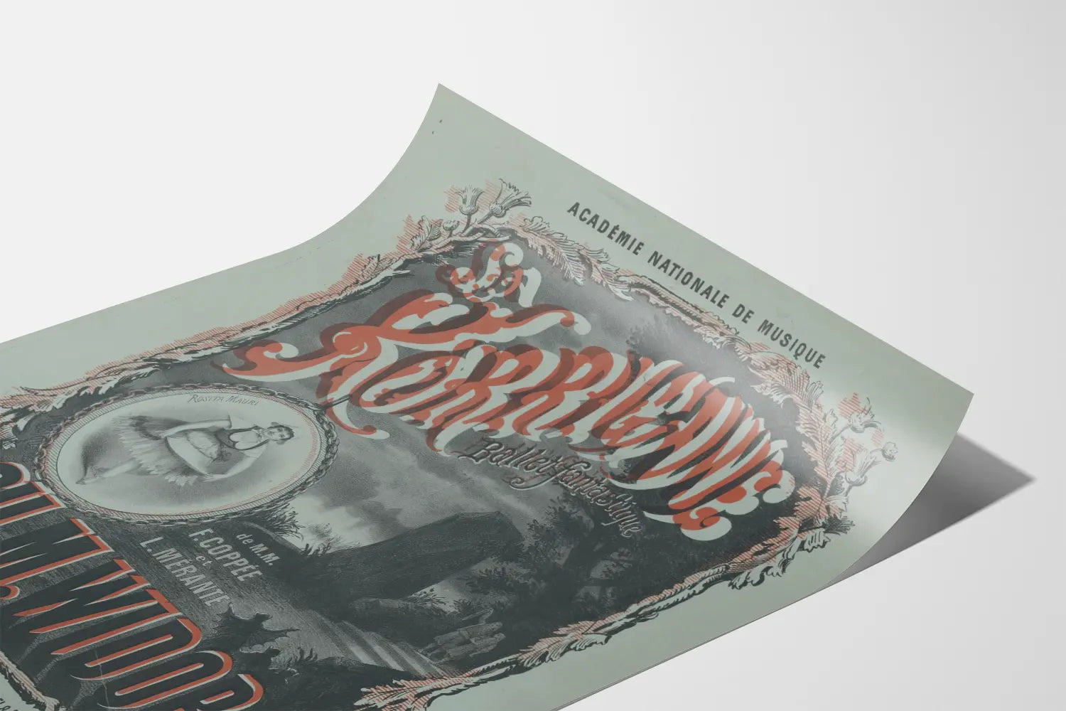 Upptäck denna gamla och autentiska affisch som föreställer "La Korrigane", en fantastisk balett som framförts av den Nationella Musikakademin. Denna unika väggdekoration påminner om estetik och atmosfär från musikaliska föreställningar och klassiska baletter, perfekt för en originell inredning med musik- eller retrotema. Affischen lyfter fram den prestigefyllda kompositören Ch. M. Widor, samt medarbetarna F. Coppée och L. Mérante, vilket stärker dess historiska och kulturella karaktär. Teckningen visar en ram prydd med svarta och vita växtmotiv, med en central illustration som väcker en mystisk och förtrollande stämning, typisk för den fantastiska världen av korriganer, legendariska bretonska varelser. En oval porträttbild av en balettdansös i balettskostym kompletterar bilden och tillför en touch av poesi och elegans till affischen. Denna vintageaffisch är ett perfekt val för musikälskare, balettentusiaster och inredningsintresserade som vill tillföra en touch av elegans och nostalgi till sitt hem. Lätt att rama in och montera, passar den lika bra i ett vardagsrum, ett bibliotek eller ett kontor, och speglar den rika konstnärliga arv och scenkonst. Denna konstnärliga bit är också en vacker hyllning till tidsenliga föreställningar och franska musiktraditioner, samtidigt som den erbjuder ett dekorativt element fullt av historia.