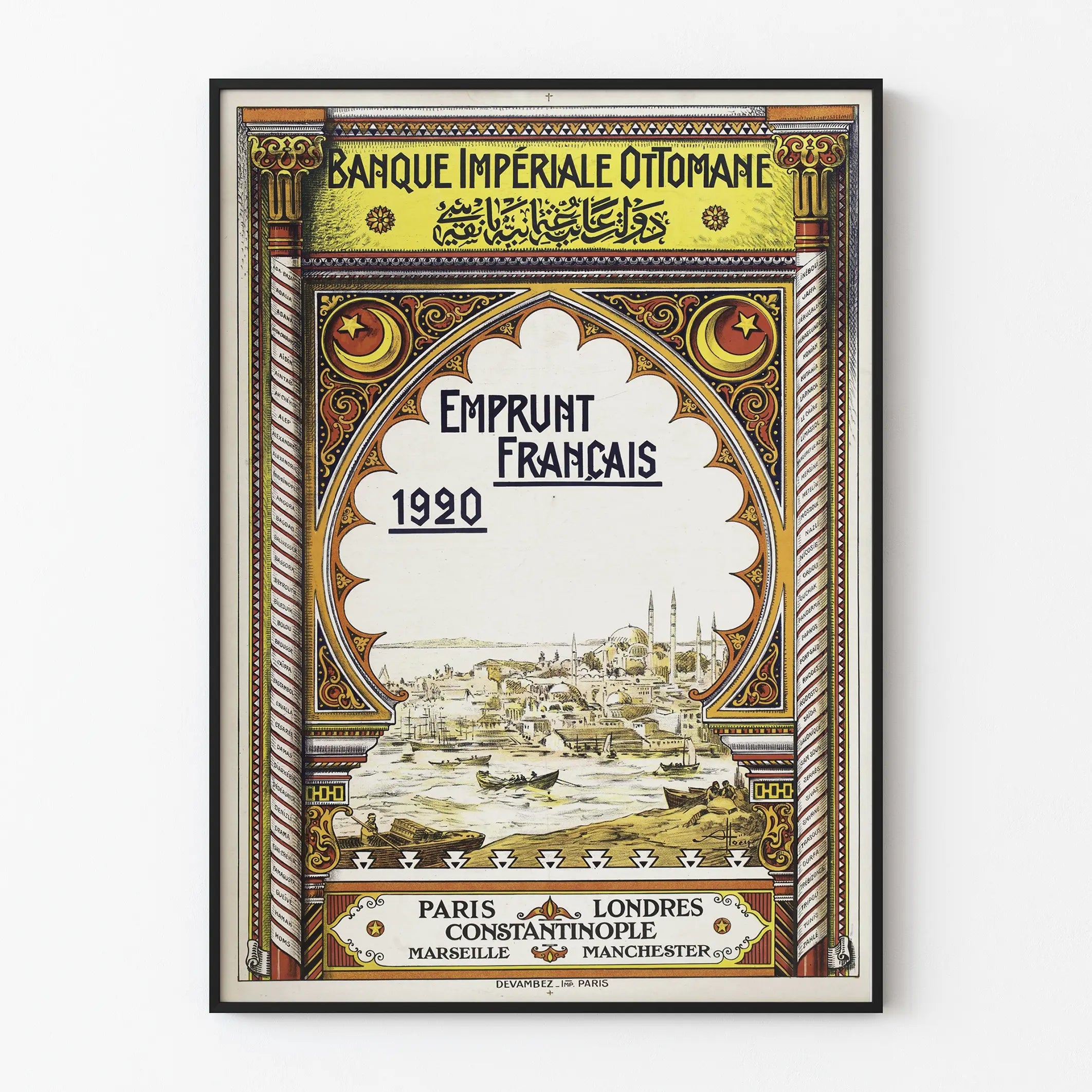 Detta gamla affisch från Ottomanska imperiets bank från 1920 utgör en rik väggdekoration fylld med historia och konstnärliga detaljer. Den framhäver den «Franska lånet» i en grafisk stil som är typisk för början av 1900-talet, med en utsmyckad komposition som påminner om österländsk estetik. Affischen kännetecknas av en fint dekorerad kant, inspirerad av ottomanska arkitektoniska motiv, som omger ett historiskt marint landskap där man kan urskilja båtar och ikoniska byggnader, vilket väcker minnet av Konstantinopel under den tiden. Inskriptionerna på franska och arabiska understryker en viktig multikulturell och institutionell dimension, medan namnen på stora europeiska och medelhavsstäder som Paris, London, Marseille, Manchester och självklart Konstantinopel finns längst ner, vilket symboliserar de internationella handels- och finansförbindelserna. Denna konstnärliga skapelse utgör en perfekt harmoni mellan konst och historia, idealisk för väggdekoration i vintage-stil eller för entusiaster av ekonomisk och konstnärlig historia. Använd som affisch eller inramad tavla, den ger en äkta och förfinad touch till varje interiör, oavsett om den är modern eller klassisk. Dess vertikala format och dess färgstarka rikedom i gult, rött och svart gör den till ett anmärkningsvärt dekorativt inslag, som kan fånga blickar och tillföra karaktär till en vägg. En unik tidsperiodsaffisch som erbjuder en visuell och kulturell resa genom de ekonomiska utbytena i början av 1900-talet.